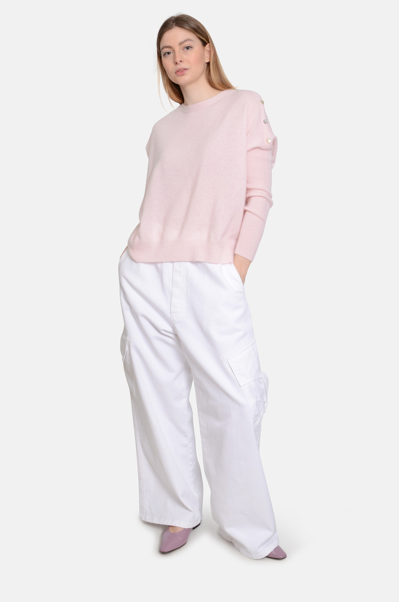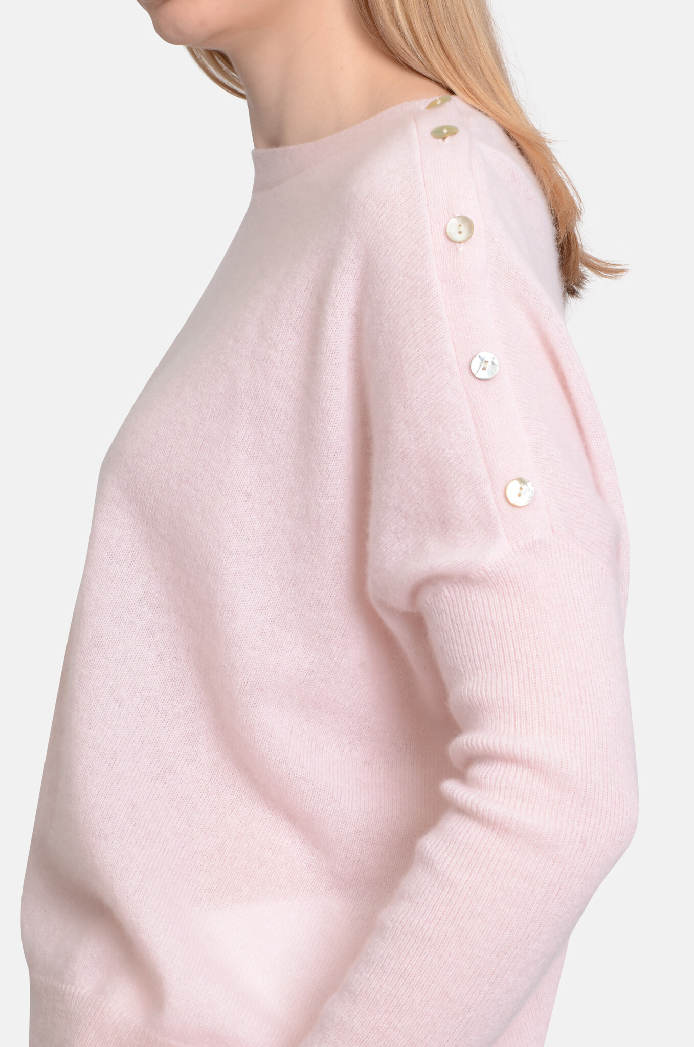 Cashmere, boatneck top with cute, pearly buttons on the left shoulder. A wide shape with fitted, long sleeves and slits on the sides.