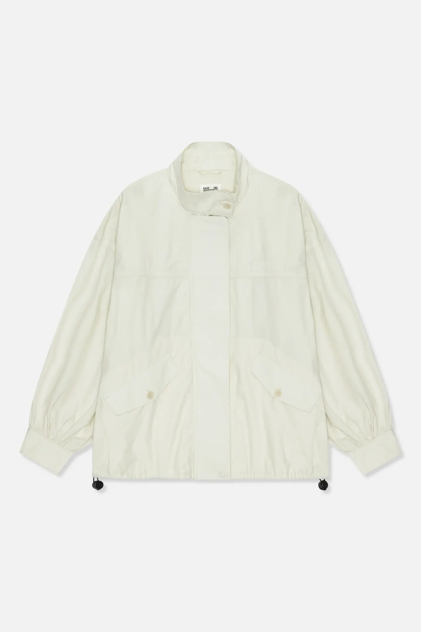 A funnel-neck, wind jacket made from a crisp cotton. It has a front zip, flap pockets, and an adjustable drawstring at the hem. There is an embroidered BP logo on the chest.