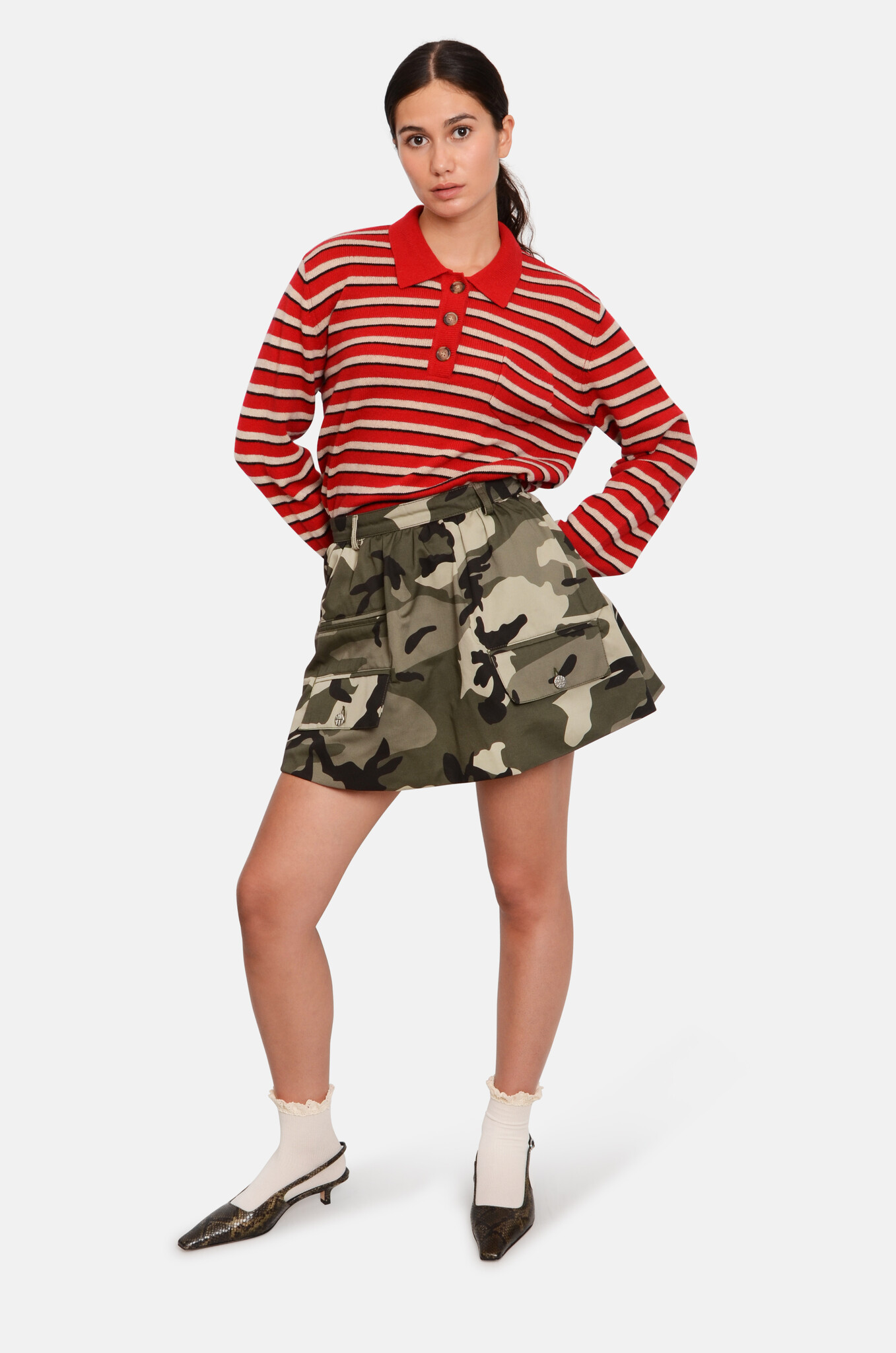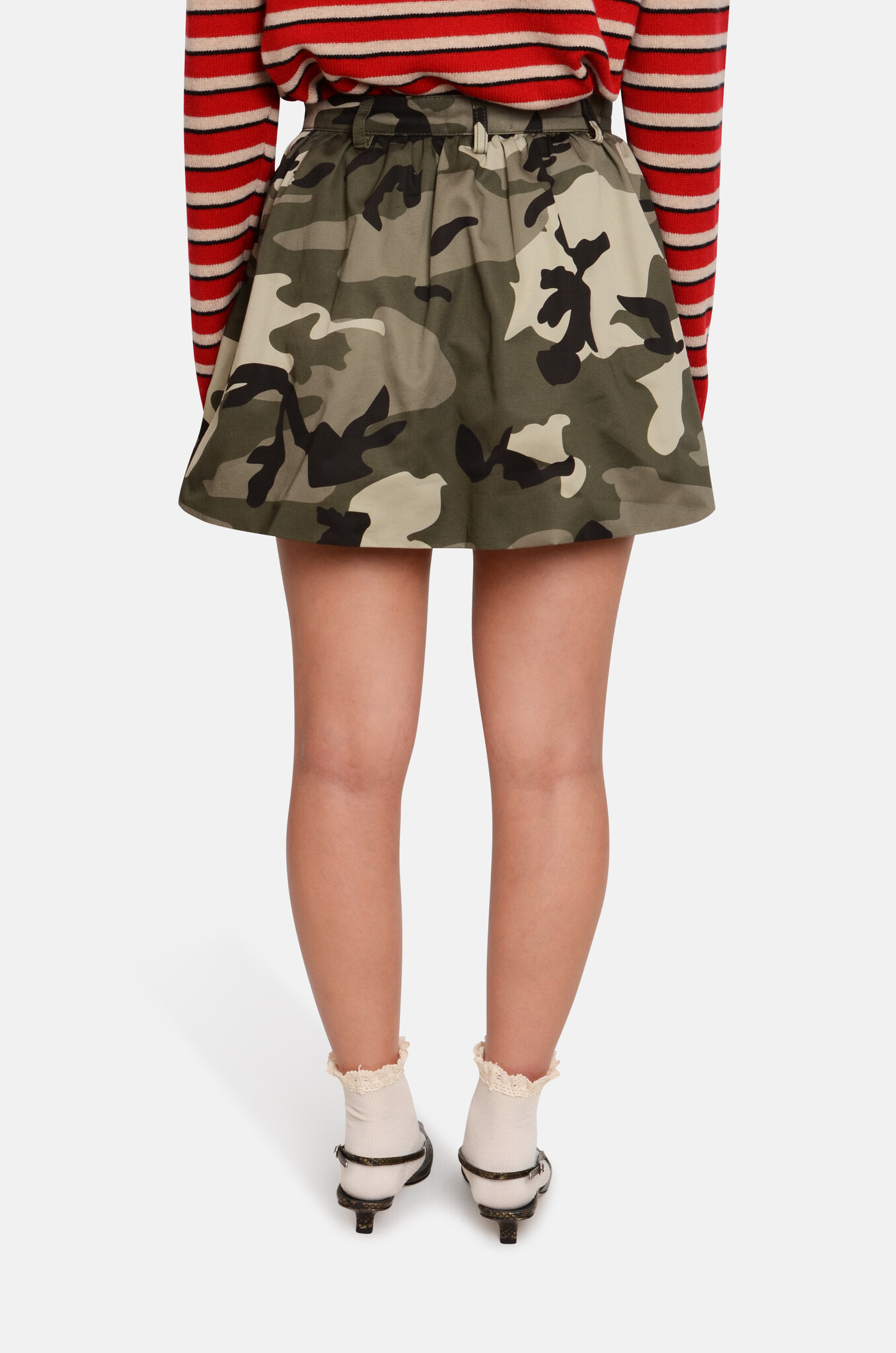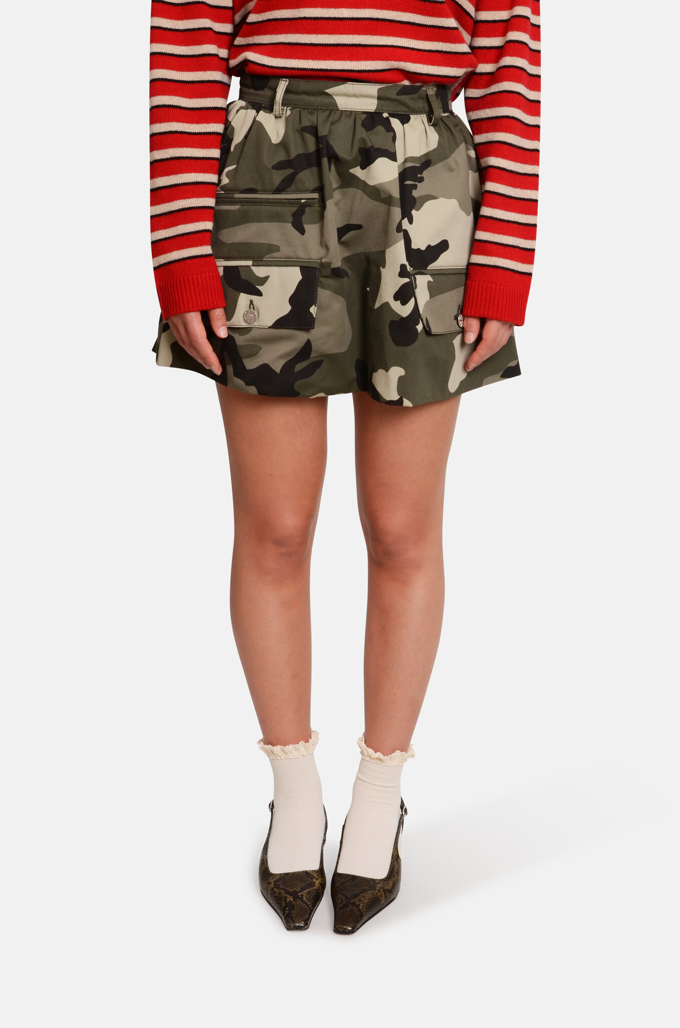 A cute mini in a bold camo print. It has a double layer, creating a bit of a voluminous bubble-shaped cut. It has patch pockets in the front.