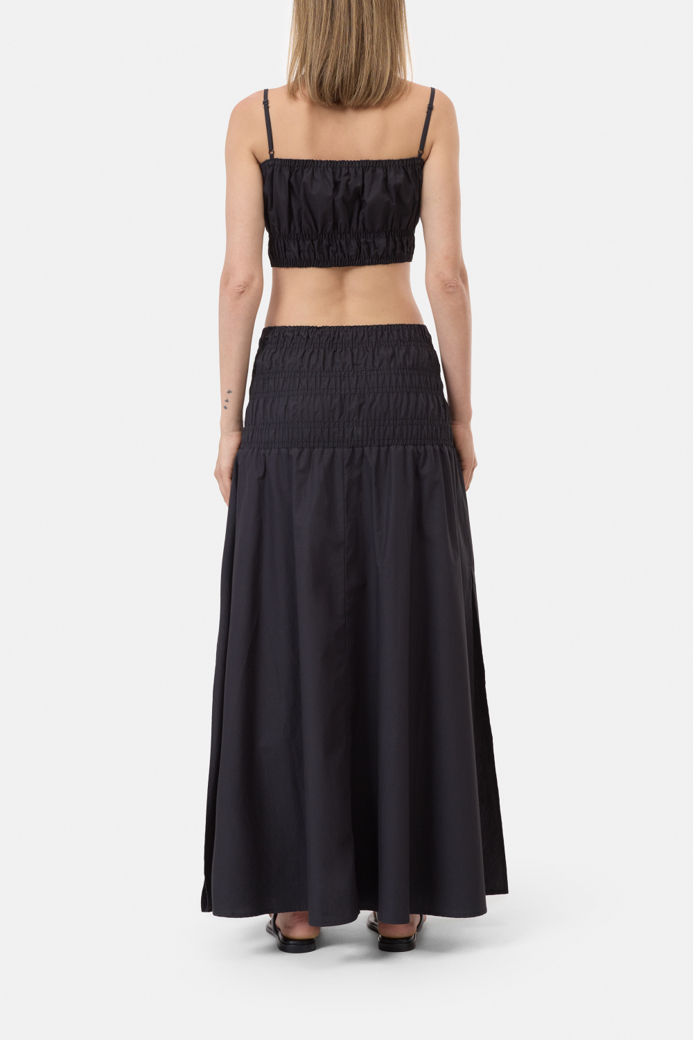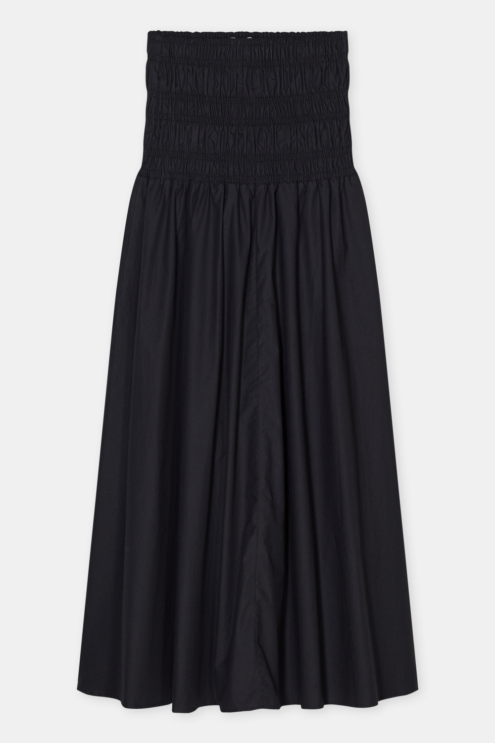 A poplin, maxi skirt with a high rise with an elasticated, smock waistband. Can be worn as a dress too. Made in Portugal.