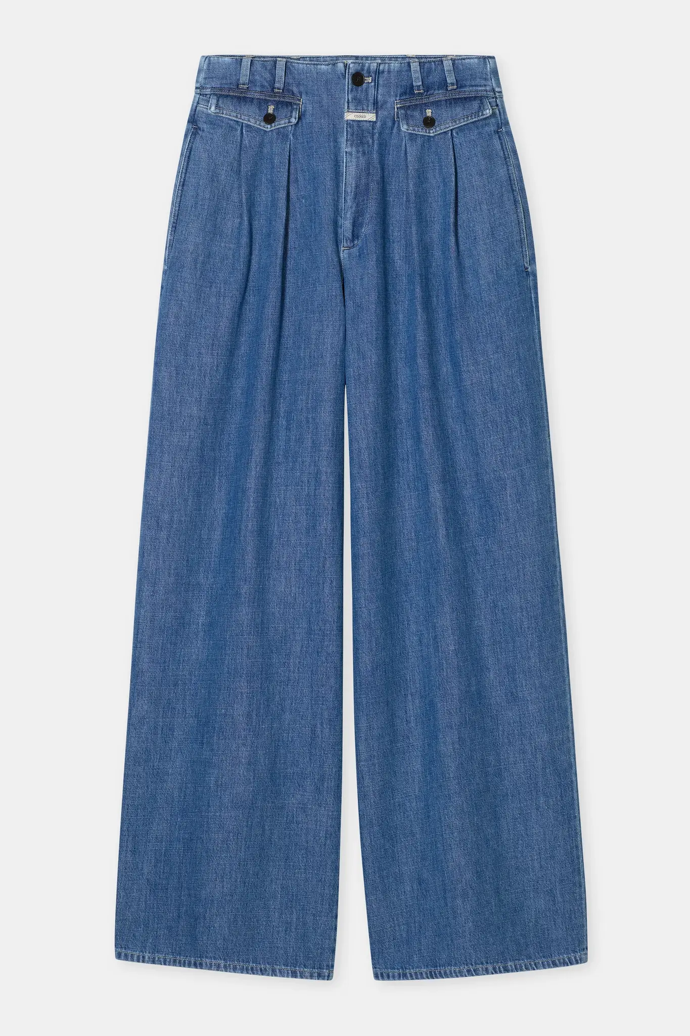A wide-leg cut with a flattering high waist, special waistband construction and buttoned front pockets that turn into pleats. Made from lightweight, super-soft indigo blue denim (8.5 oz) with an authentic twill weave.