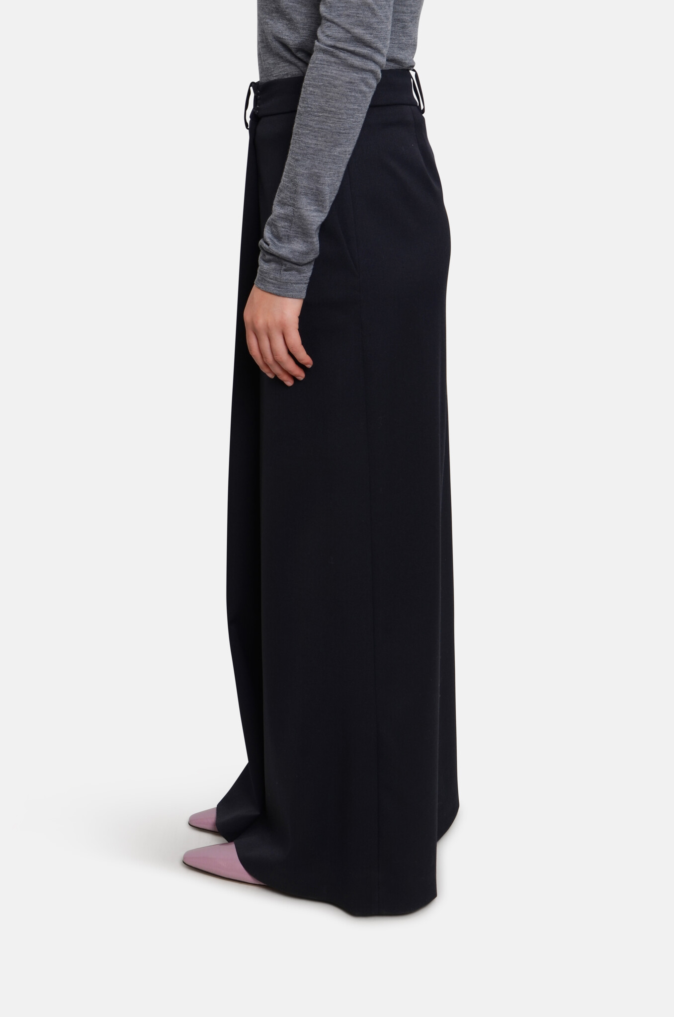 Wool gabardine, long skirt with assymetrical details, a centre front slit and welt pockets with button detail. Made in Italy.