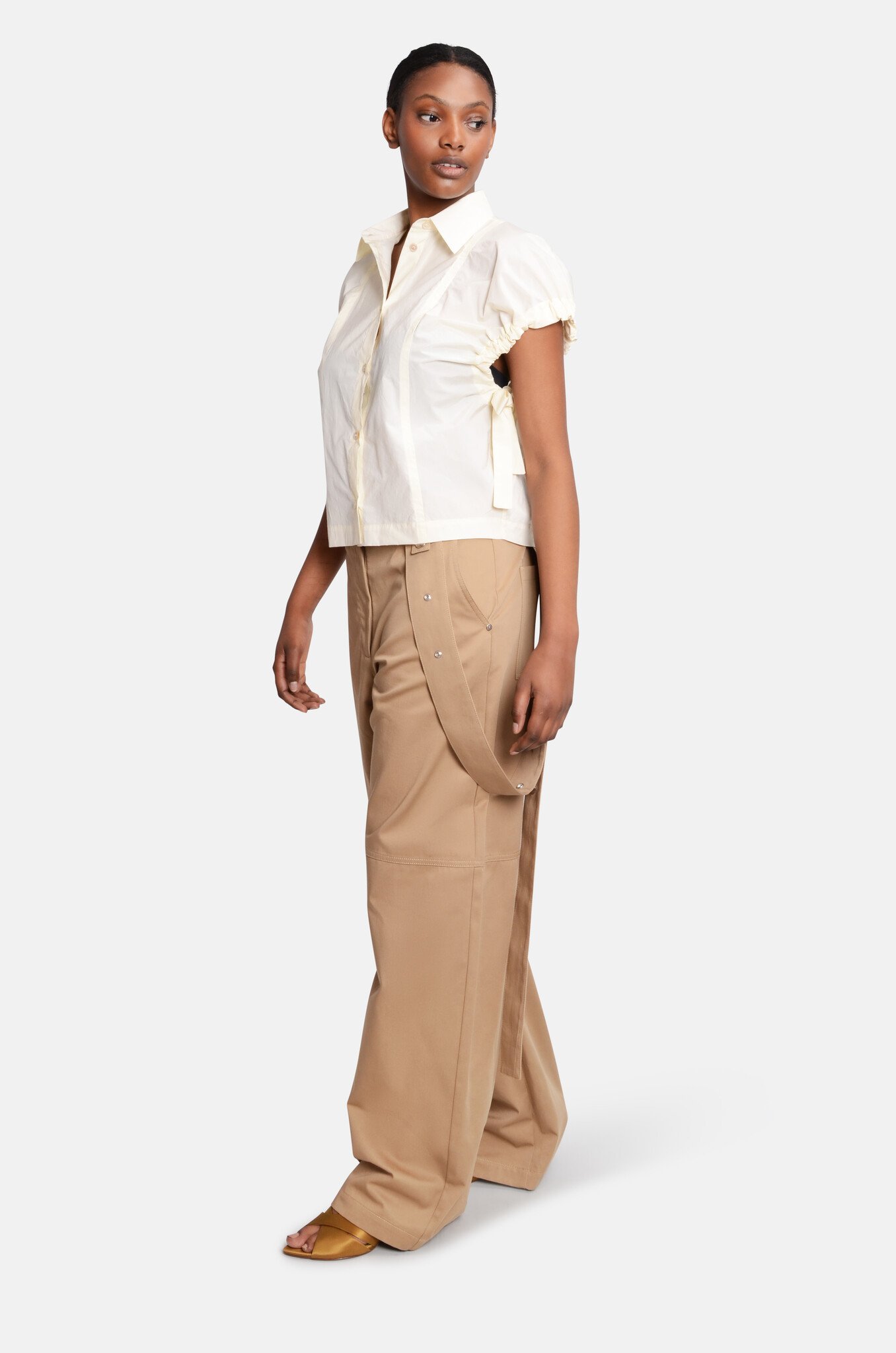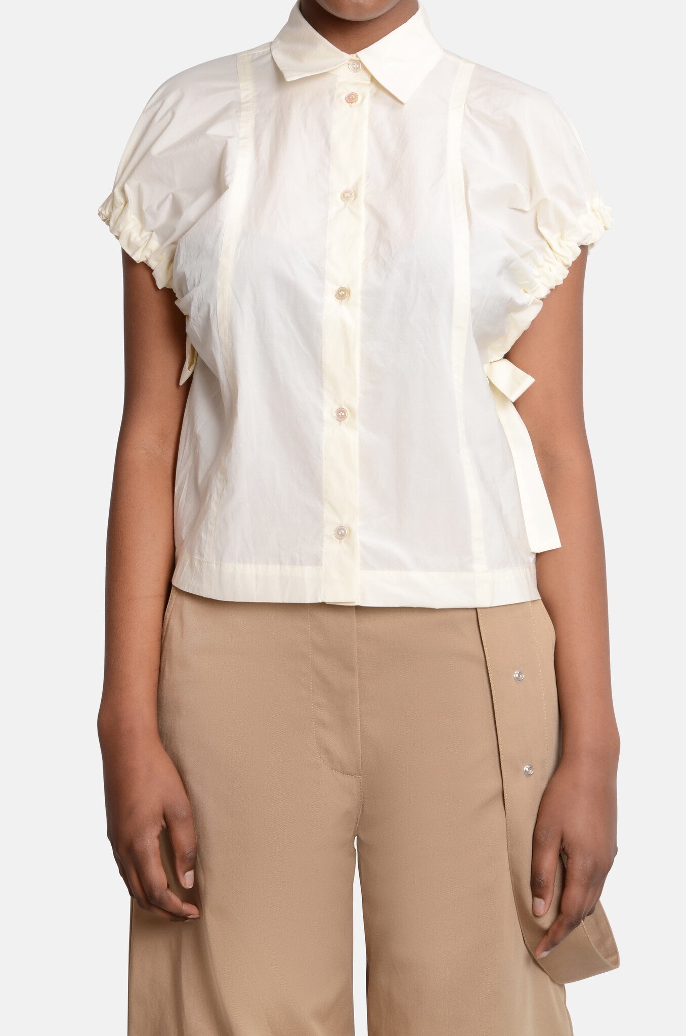A lightweight, fitted shirt in techno poplin. It has short, puff sleeves with ruffled details with adjustable cute, ties. Made in Italy.