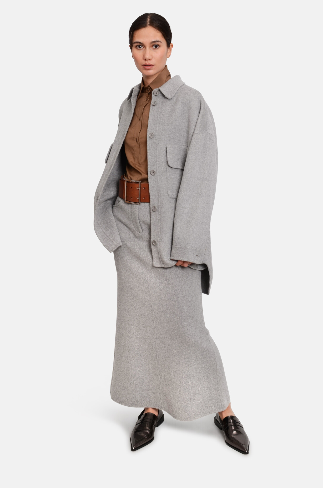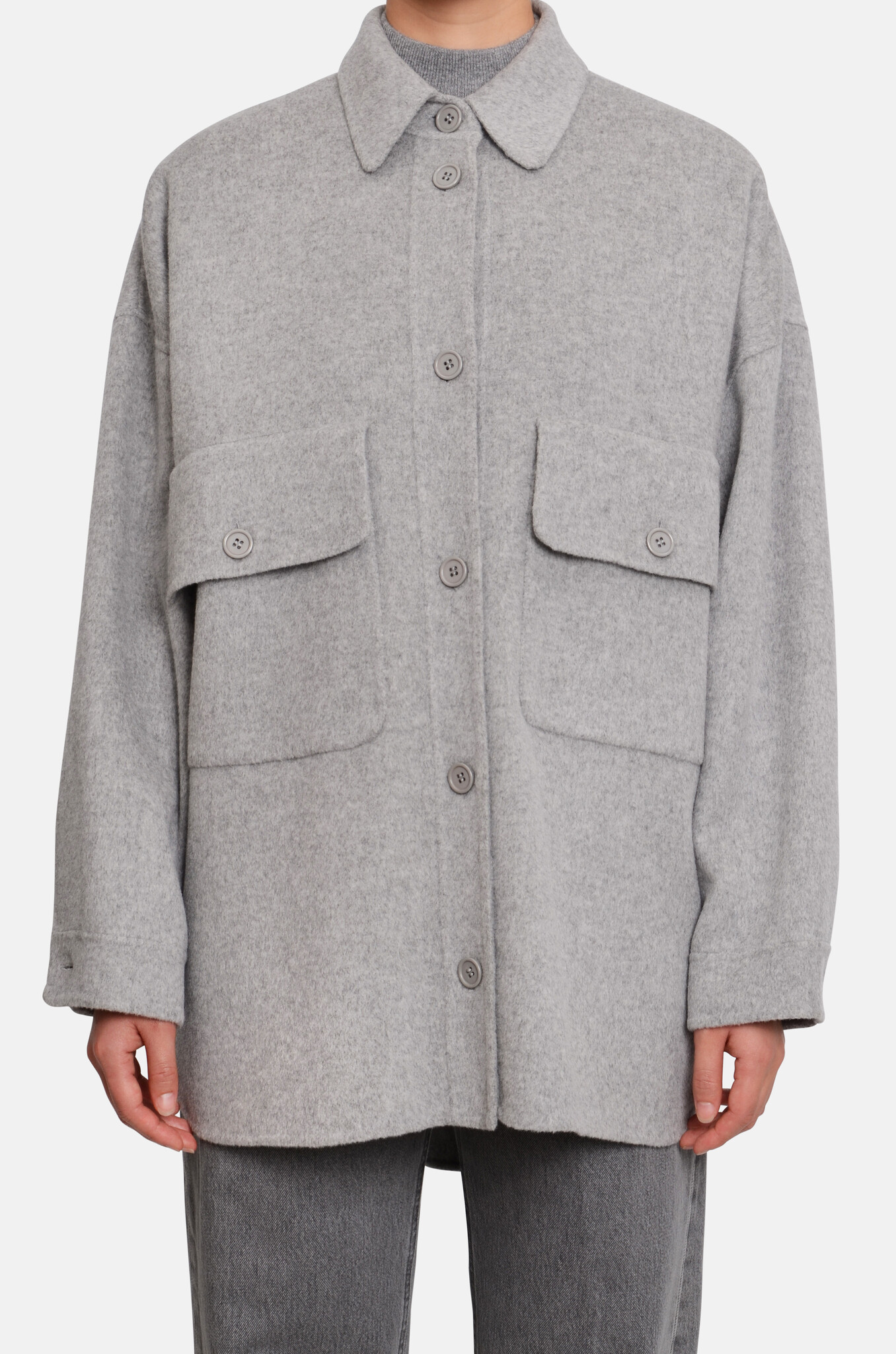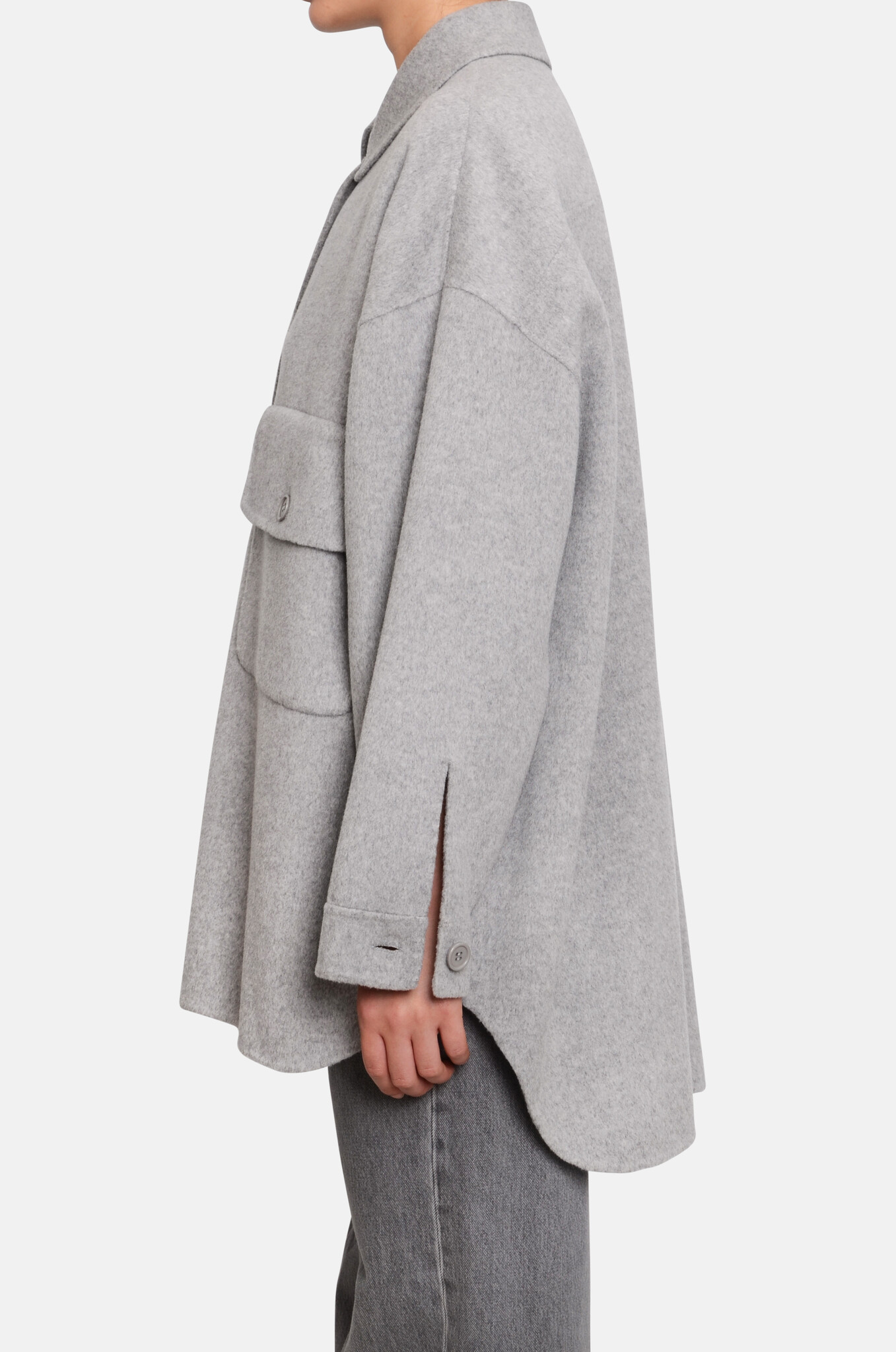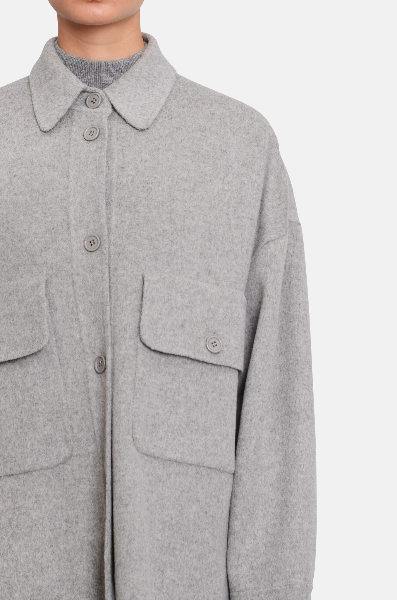 Wool overshirt in a soft double fabric, created by hand-stitching two thin layers to achieve a double-face finish. It has patch pockets and a drop shoulder.