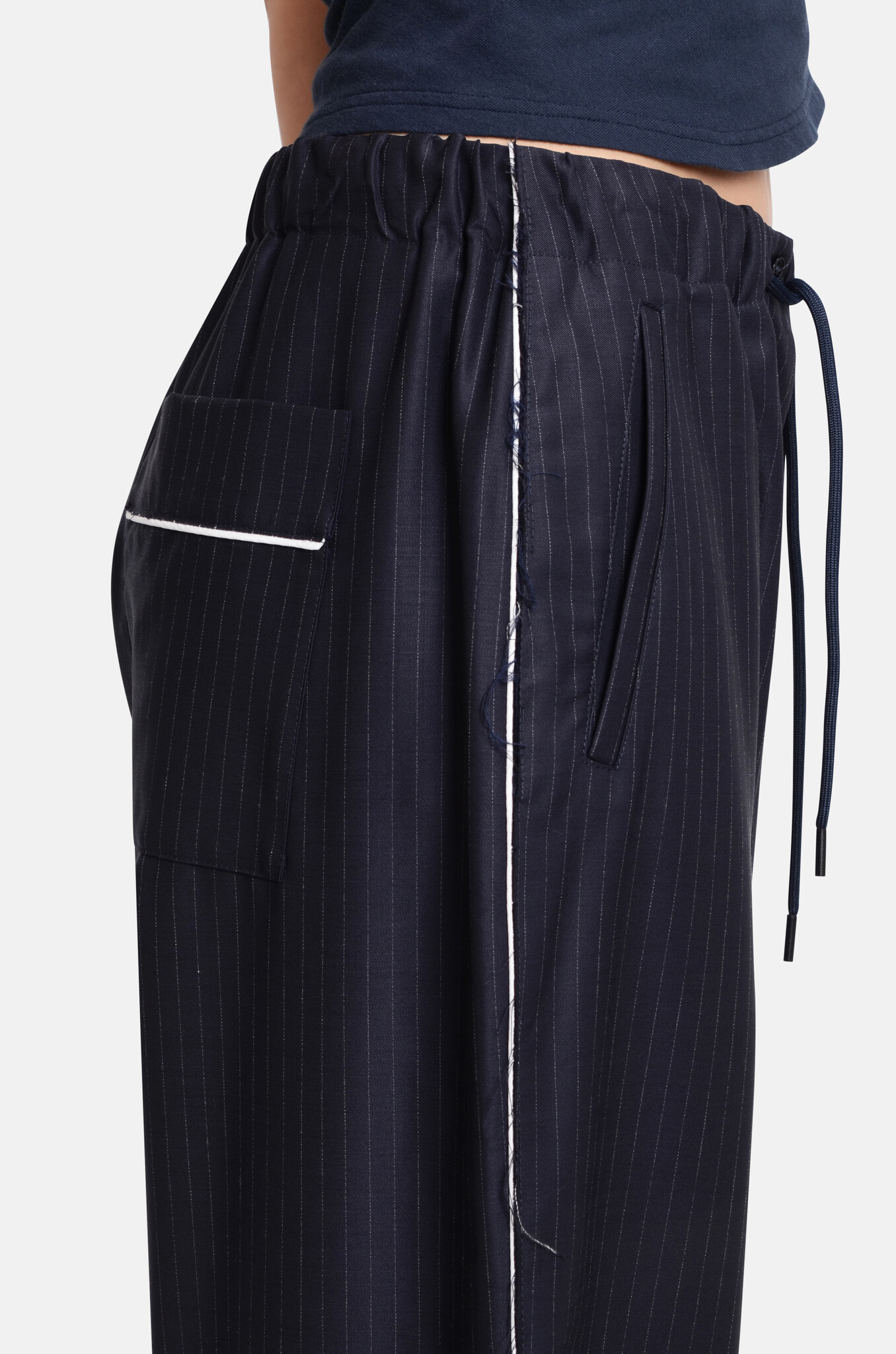 Tailored, pj-inspired trousers in an Italian navy pinstripe, light wool. It has a straight, wide leg, an elasticated waist, a contrasting white piping along the side seams and one back pocket. Frayed, raw hems all-over. Designed with a relaxed fit.