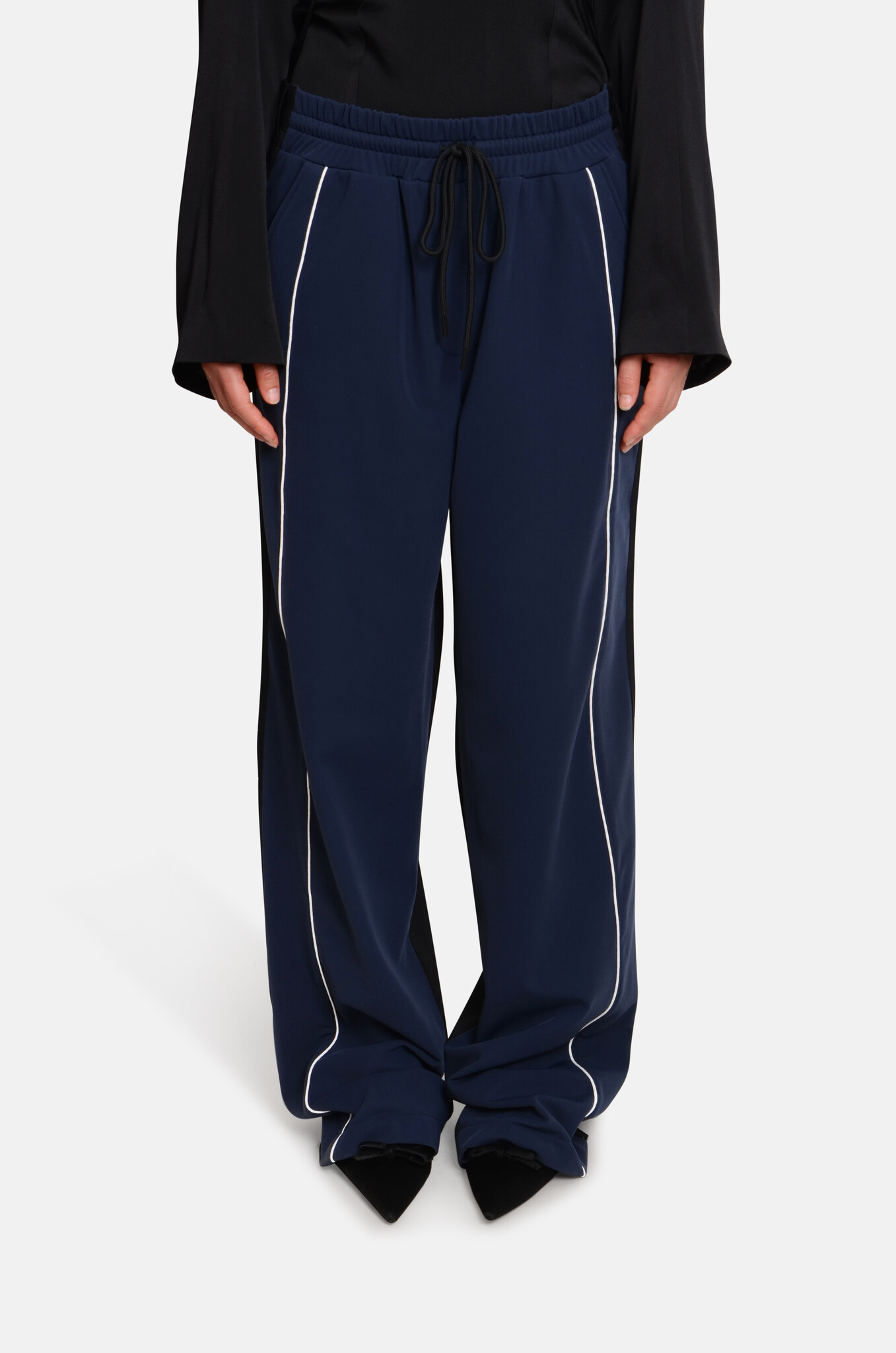 Upcycled pants made of a tracksuit pant panel in the front and a black, pinstripe trouser panel in the back. Drawstring closure. Designed in Belgium.