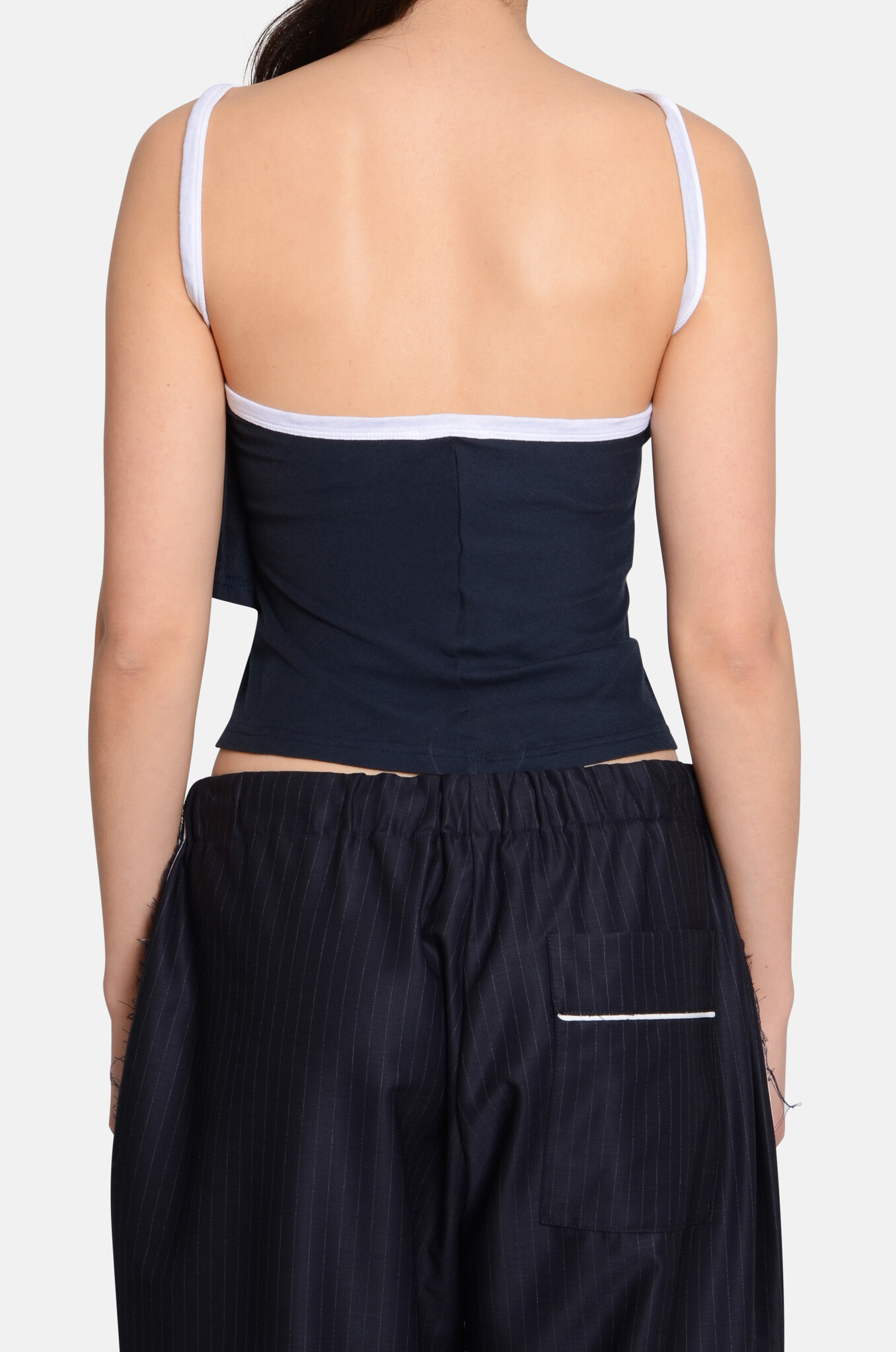 A fitted, wrap-style tank top in Portuguese cotton. It has a twisted front construction that wraps across the body to create a dynamic crossed neckline.