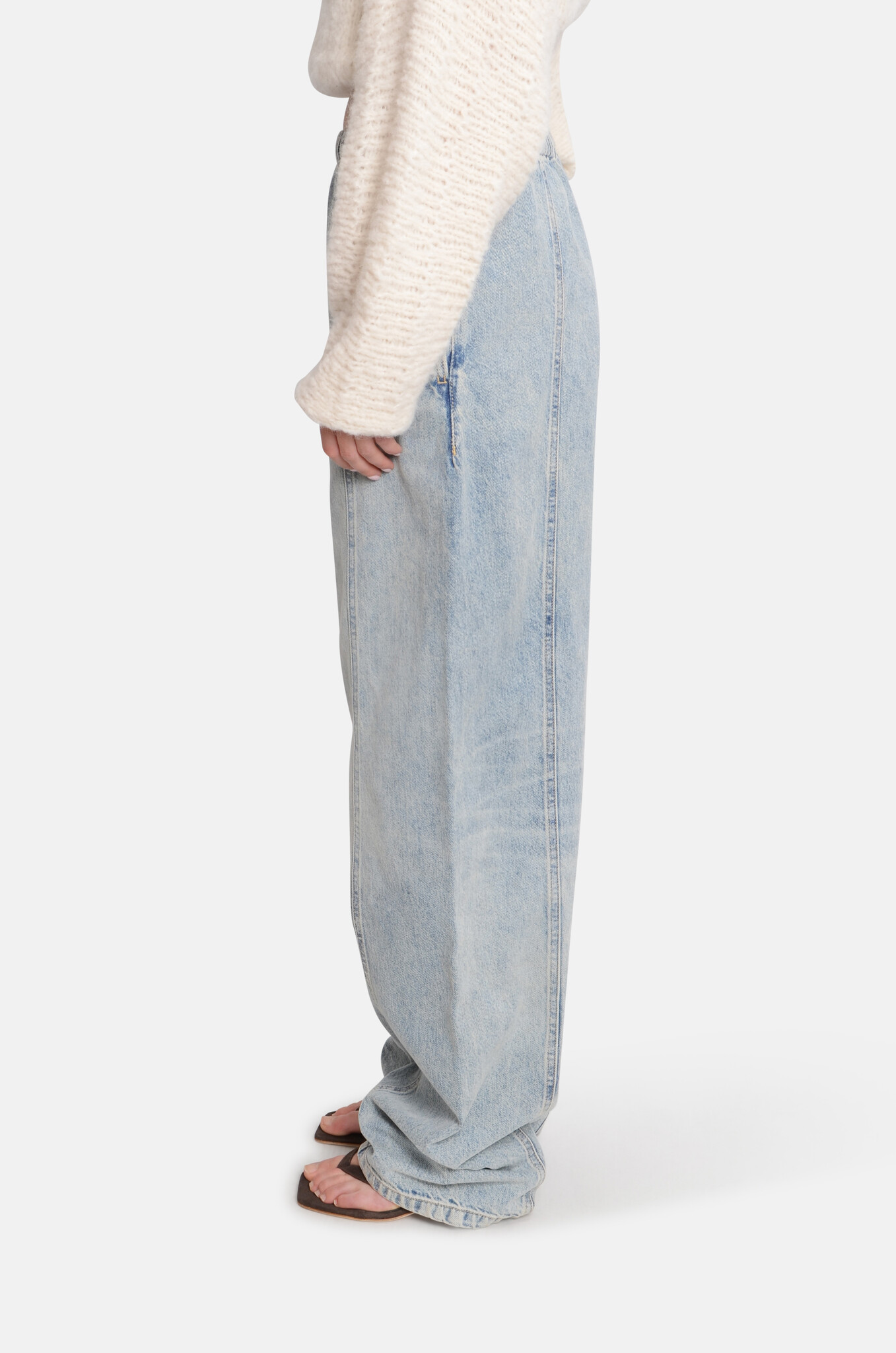 Relaxed, extra-long jeans with a curved leg and an elastic waistband. Seams down the middle. Made in Italy.