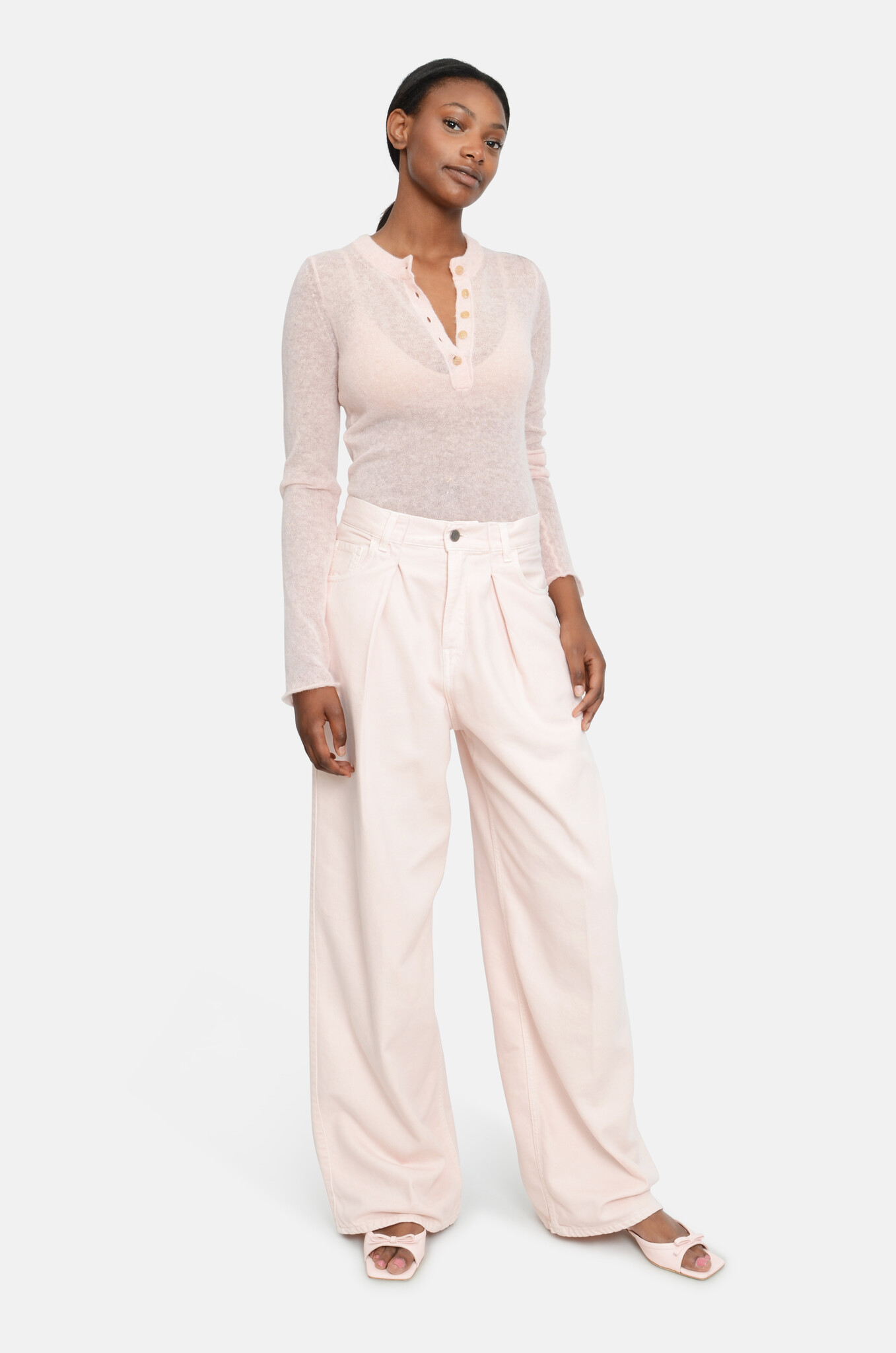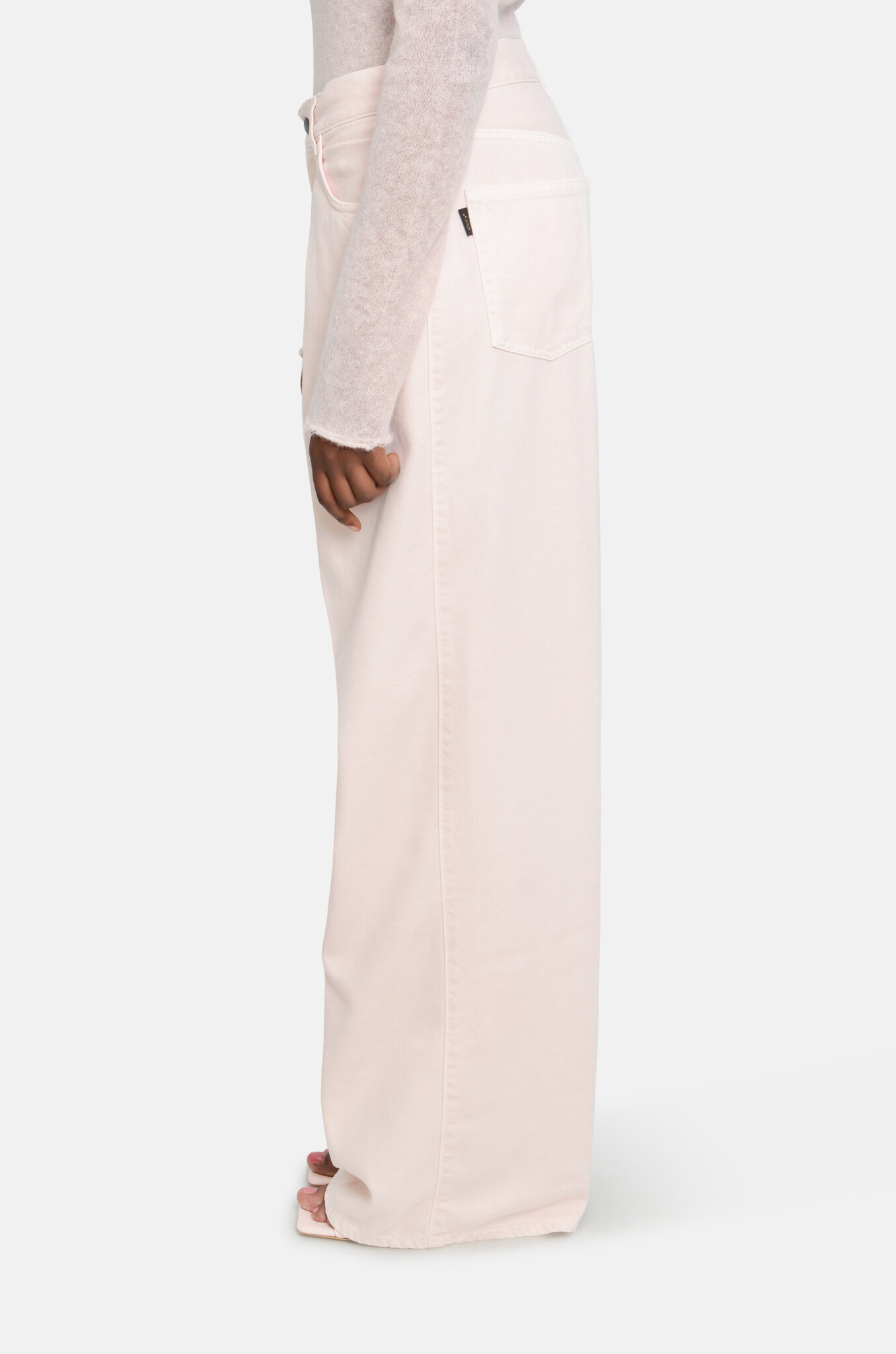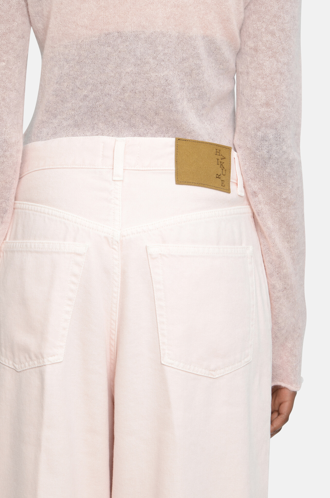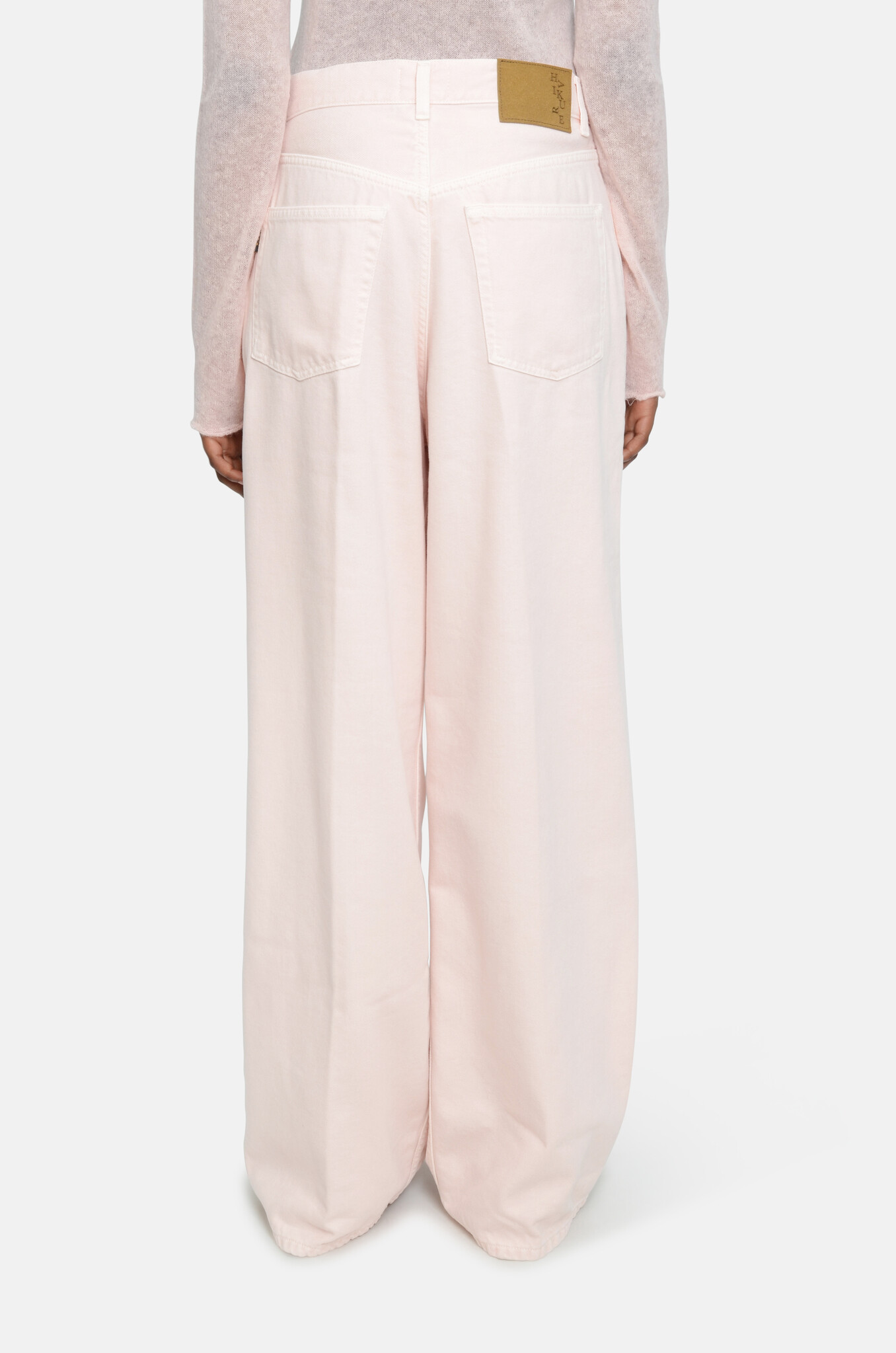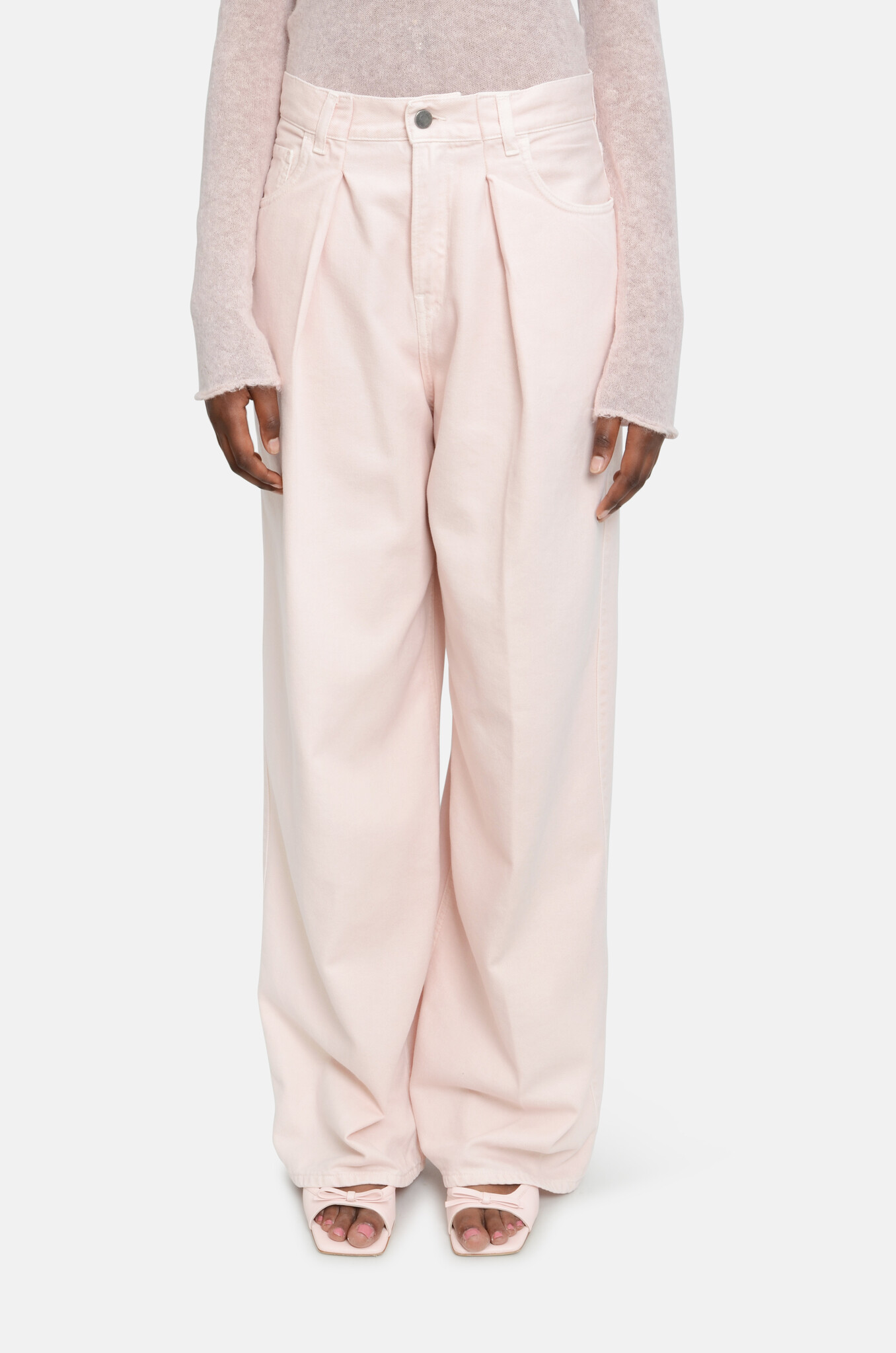 Haikure's Iconic pleated jeans made of a babypink,soft, fluid cotton-tencel blend. A wide, straight leg with a mid-to-low baggy silhouette. Extra long legs.