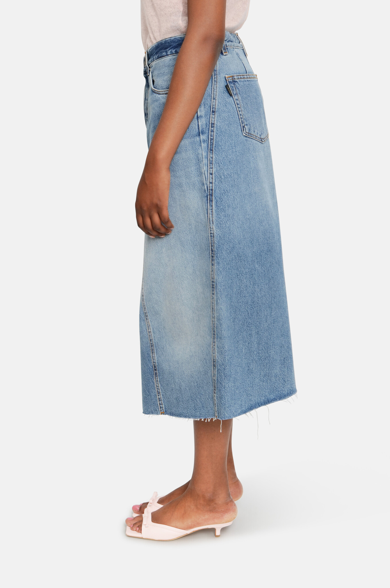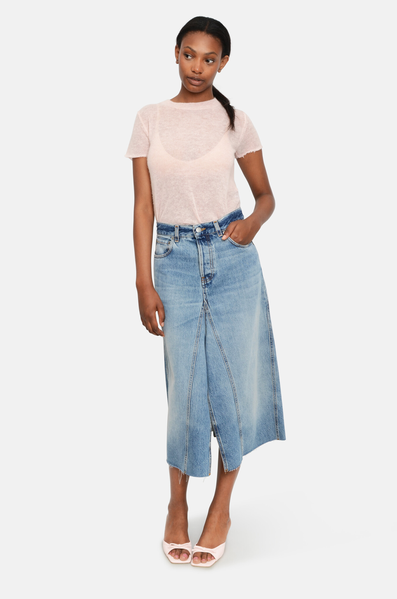 Mid-rise denim skirt consisting of different panels giving it a relaxed A-line shape that flares below the knee creating the effect of wearing jorts.