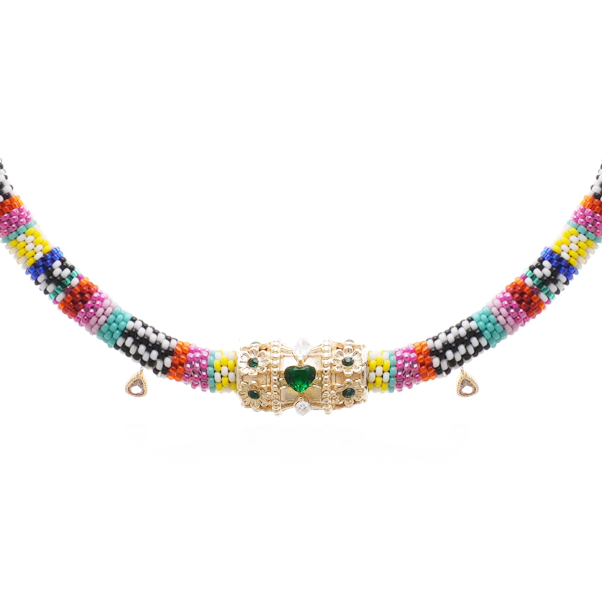 This handmade, unique necklace made of a checkerboard-effect weave of colorful Myuki Beads, accentuated at its center by a pendant, adorned with emerald green rhinestones and small diamond-effect rhinestone pendants is a fine blend between refined craftsmanship and baroque inspiration.