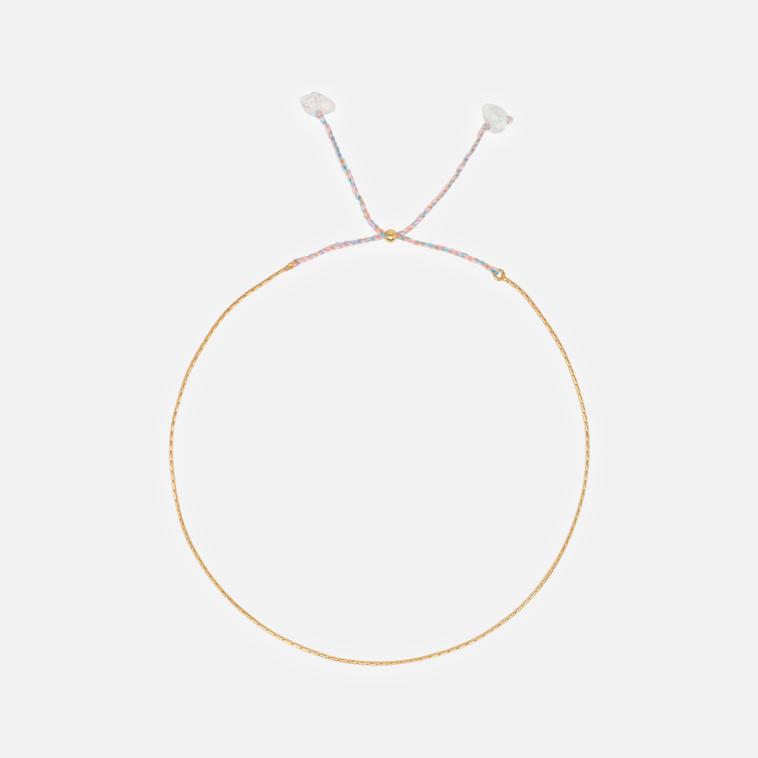 An adjustable, hand-dyed string anklet with a silver, goldplated chain.