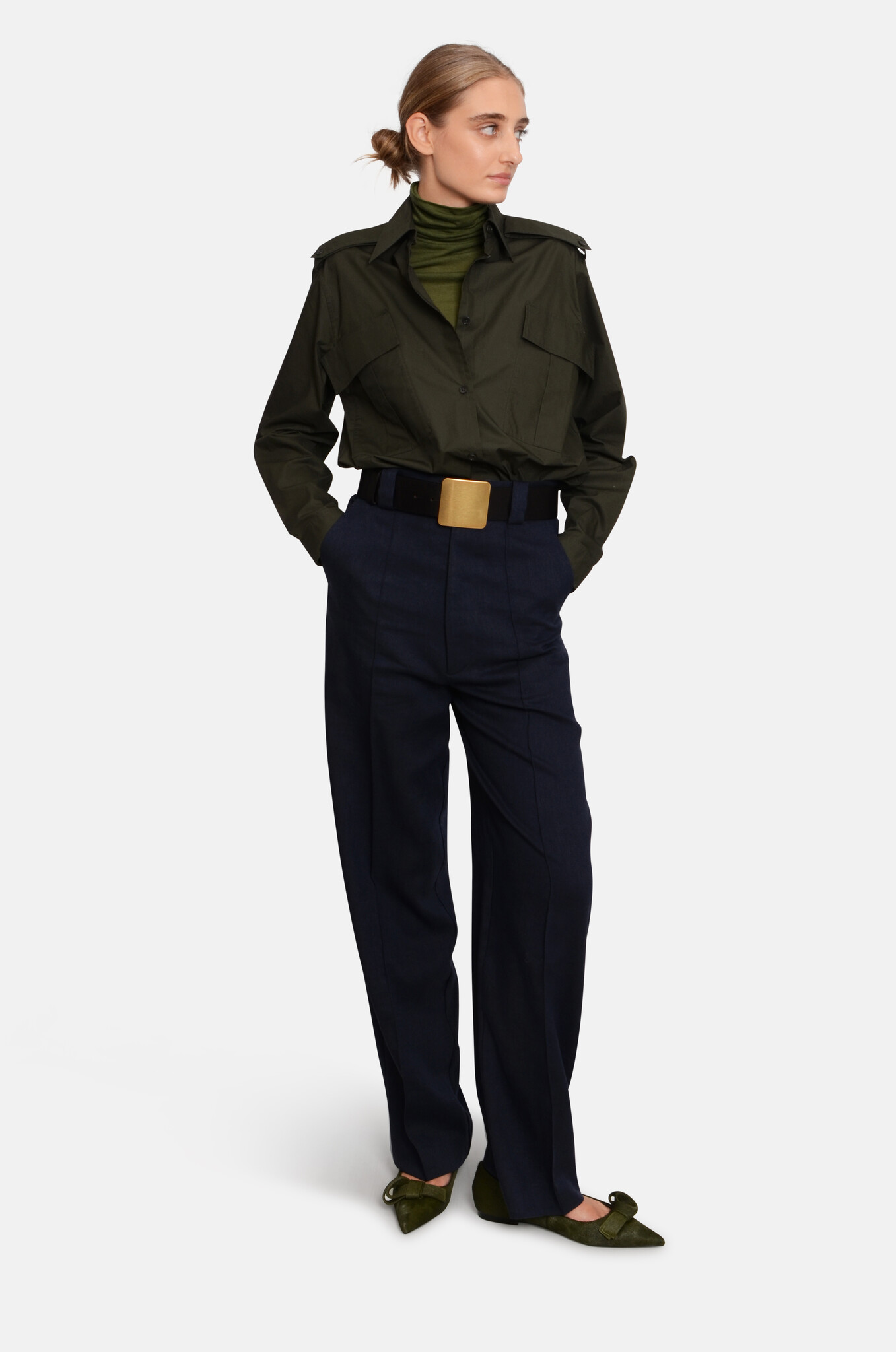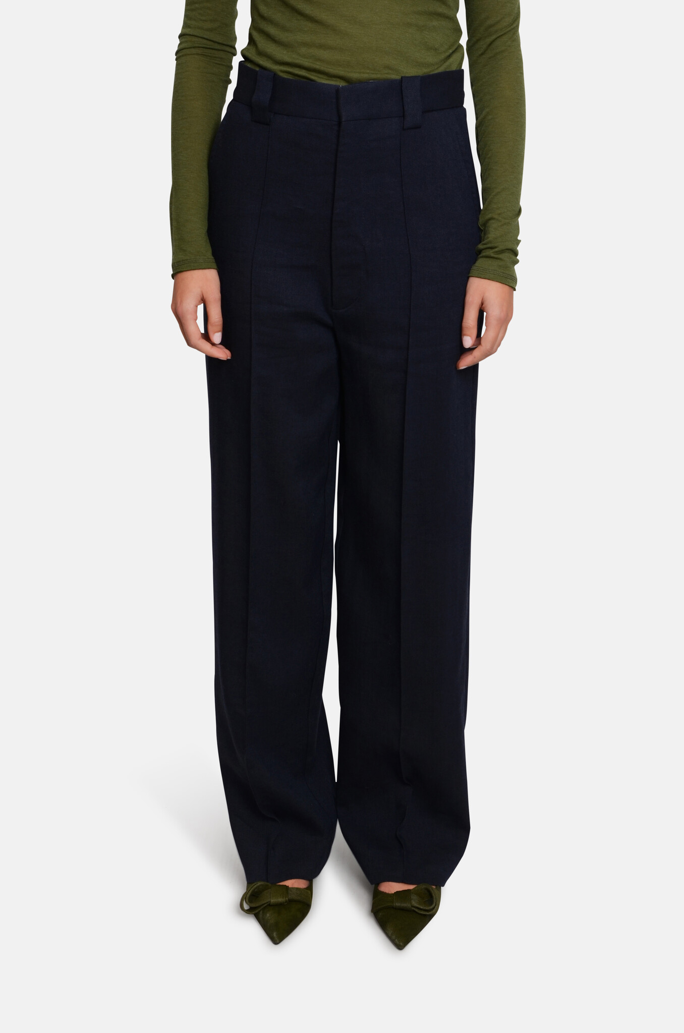 Wool-linen-blend trousers with a straight, slightly oversized cut becase of the low crotch. The button-details on the waistband makes it possible to adjust the waist to wear it a bit more high-waist and less baggy.