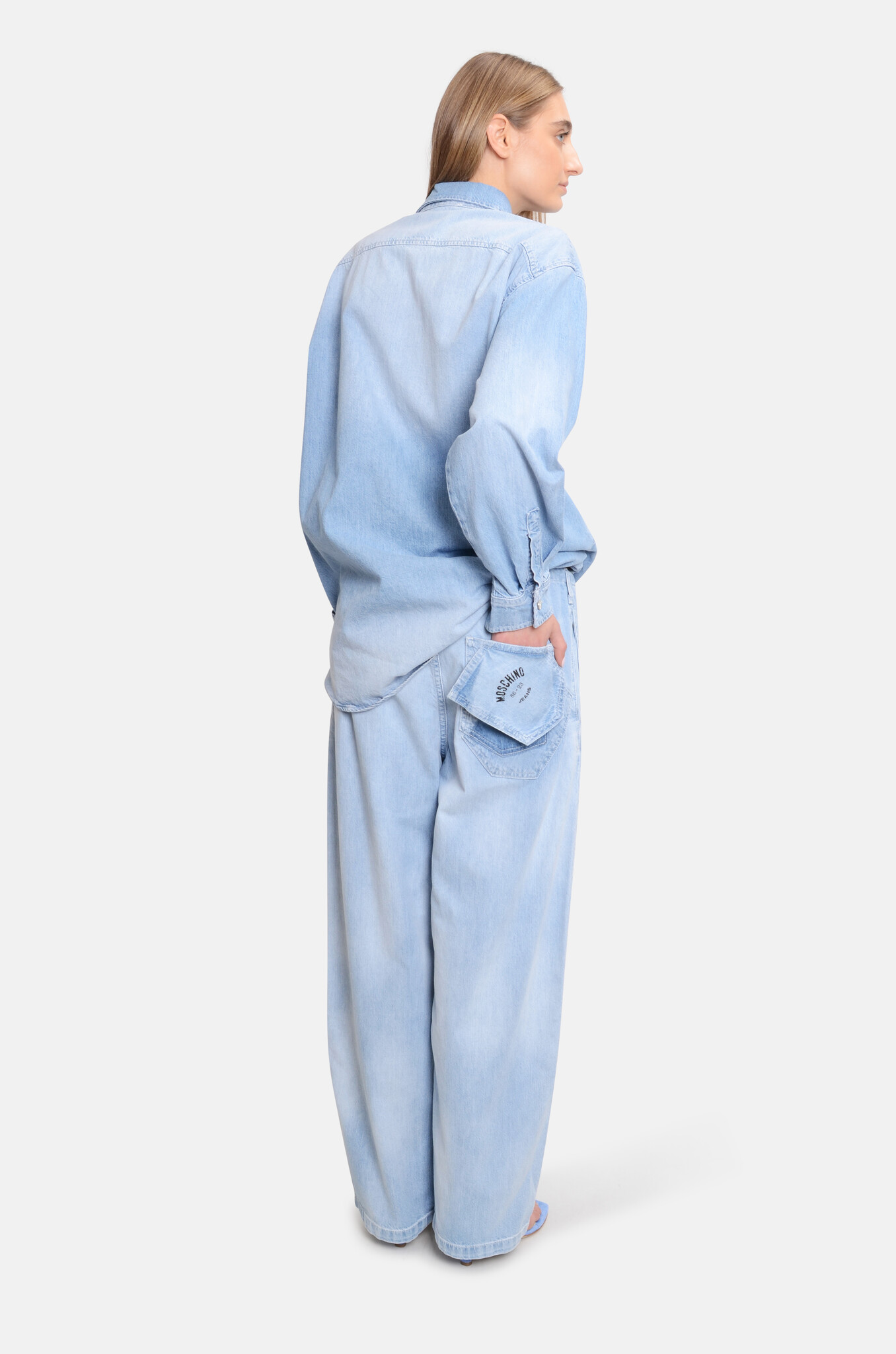 Lightweight, drawstring denim pants with an overlapping pocket effect on the back with a printed logo that is purposely distressed. Relaxed cut.