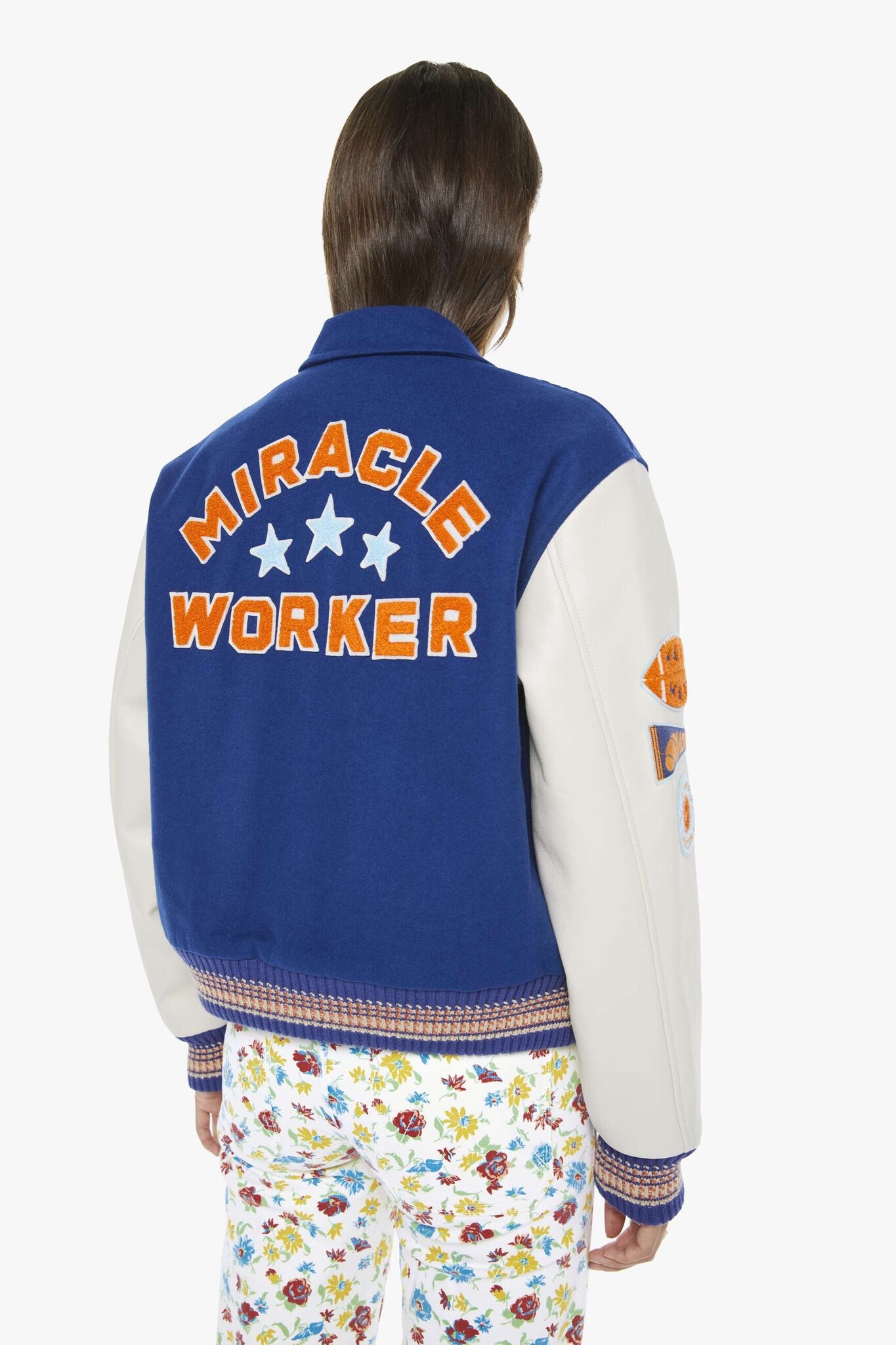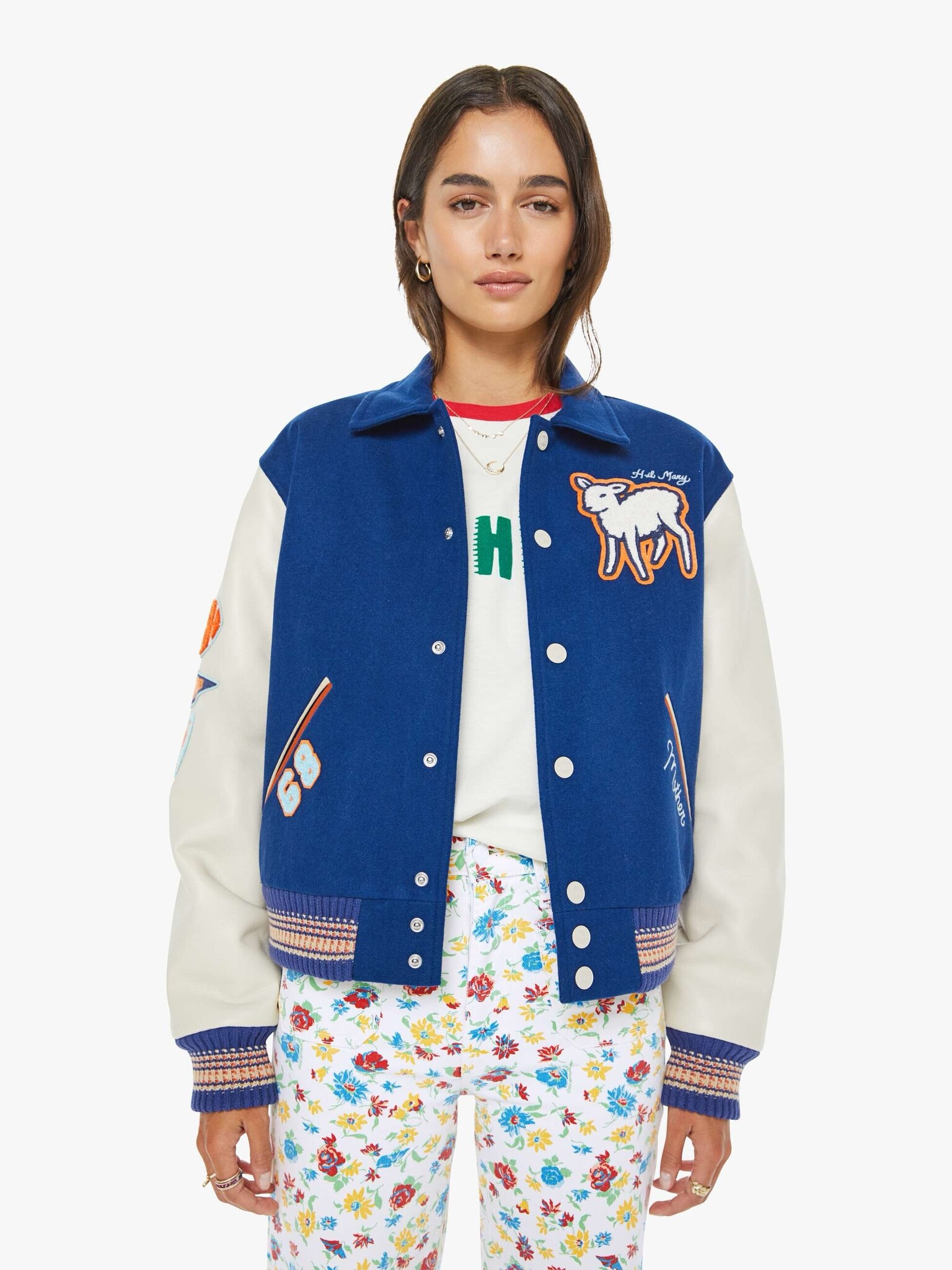 A varsity jacket made from a wool blend, Away Game is a navy with off-white sleeves, red striped details and vintage-inspired chenille patches, pins and needlepoint throughout.