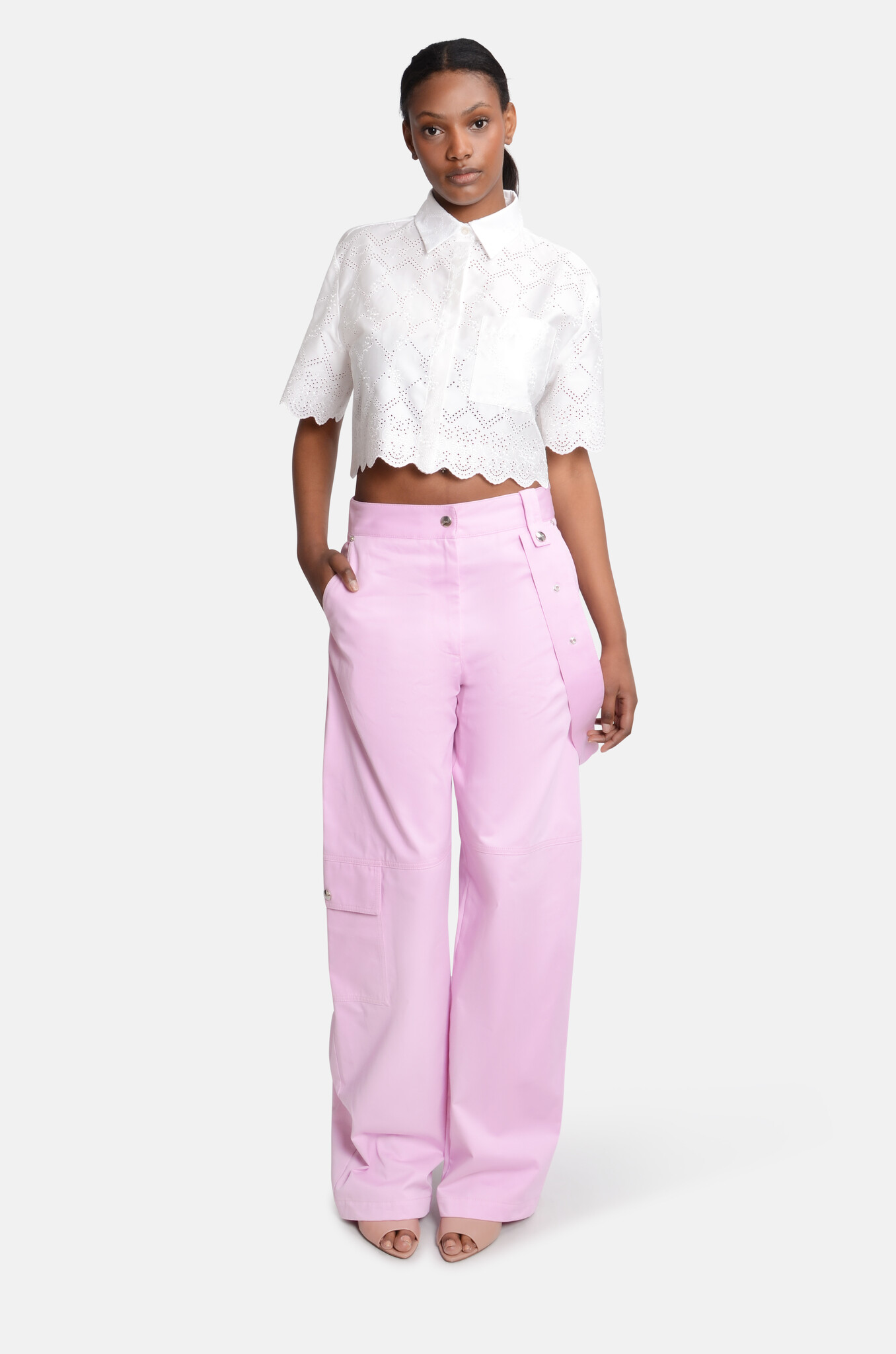 A cute shirt in a broderie Anglaise fabric with a scallop hem at the waist and sleeves. One pocket on the chest.
