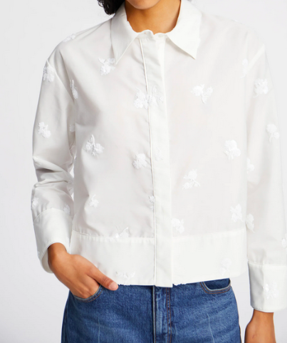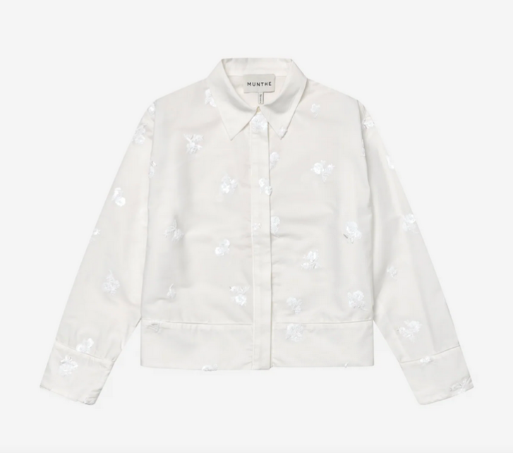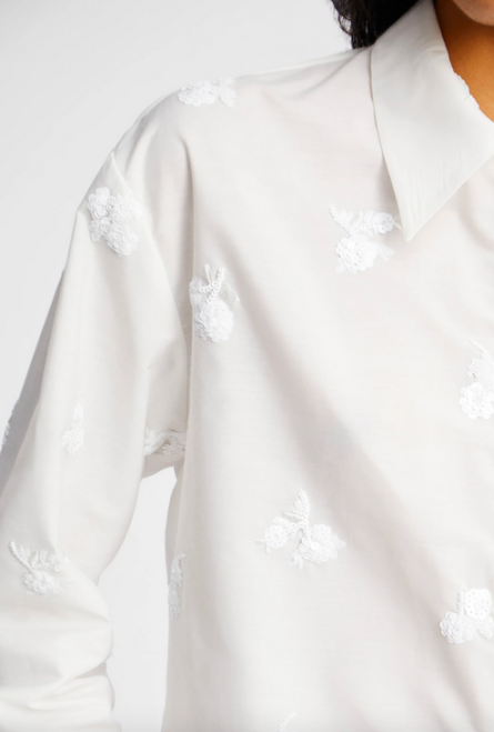 A crispy white shirt embellished with tone-in-tone sequin flowers. The shirt features elegant, wide cuffs as well as a broad hem at the bottom.