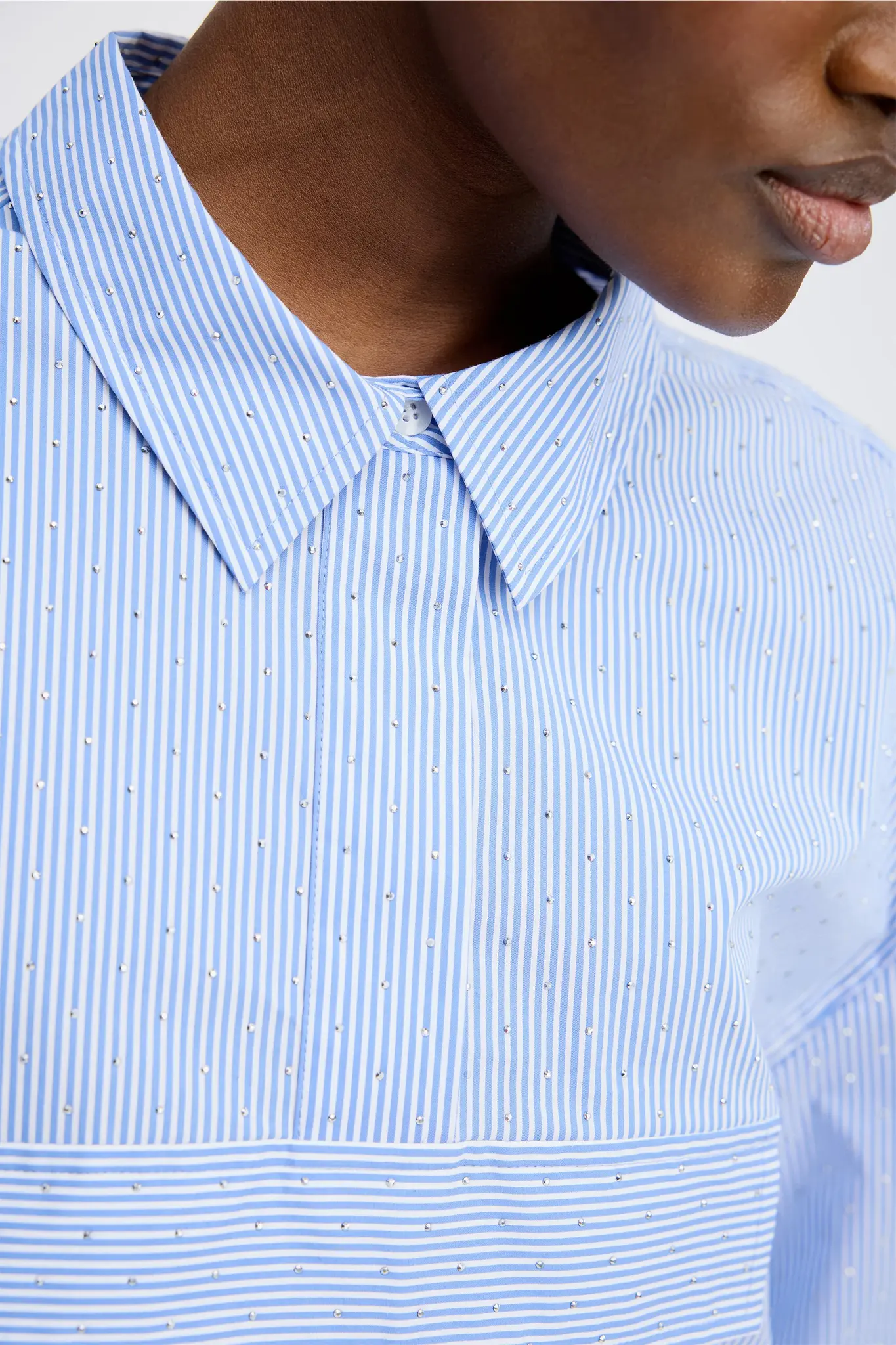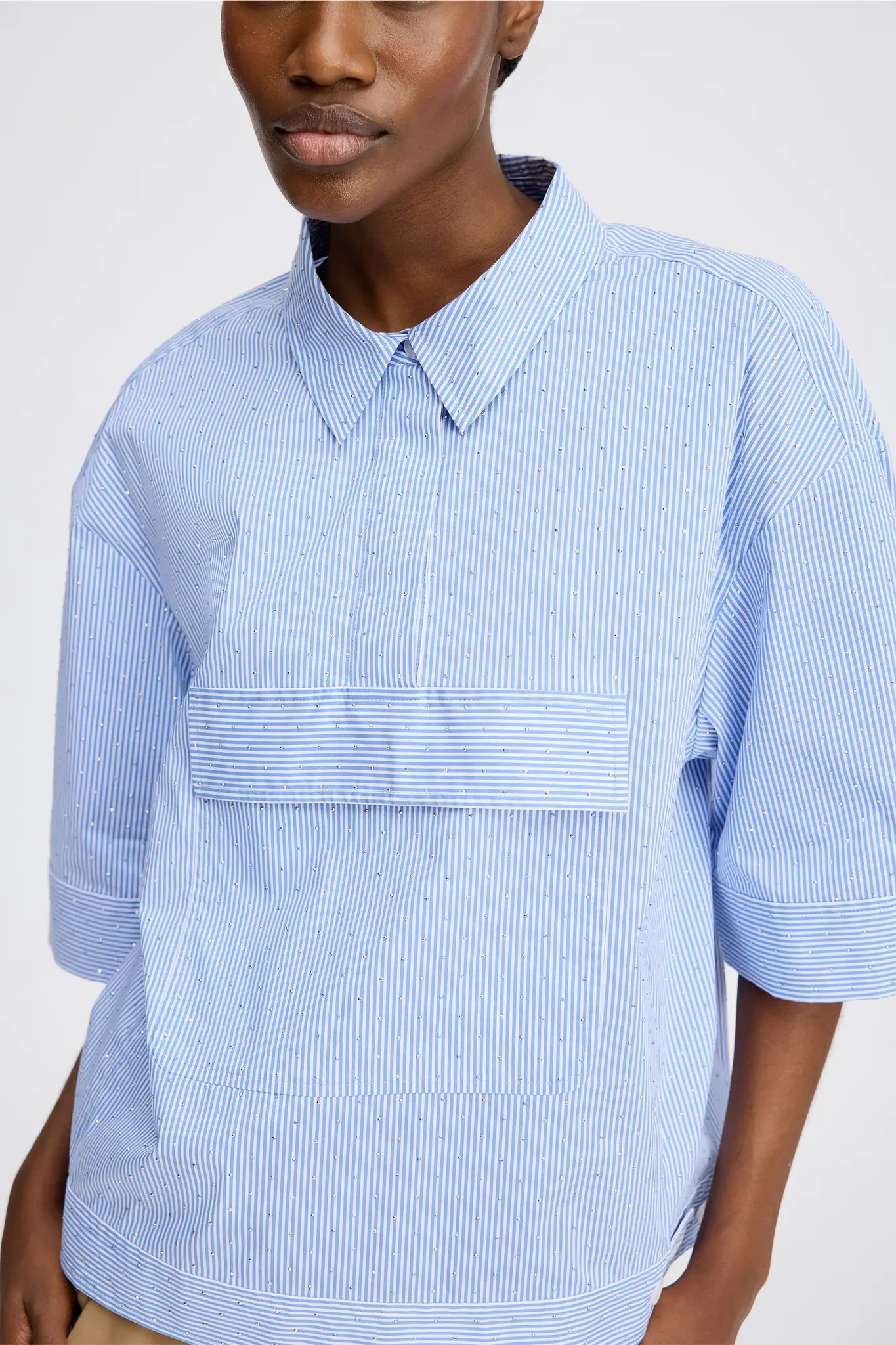 A boxy shirt with a blue and white striped pattern and delicate, small rhinestones. The shirt has a relaxed fit with short sleeves and an oversized flap pocket in the front. The shirt can be opened halfway.