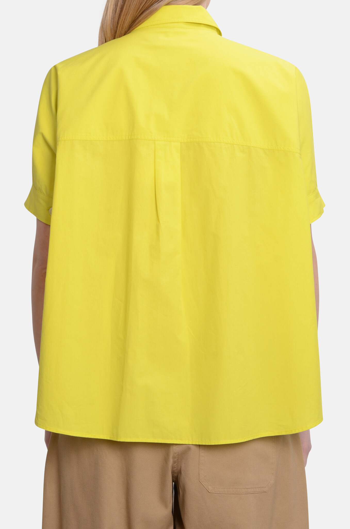 A lightweight, poplin shirt with buttoned, short sleeves and one front pocket. It has an oversized cut.