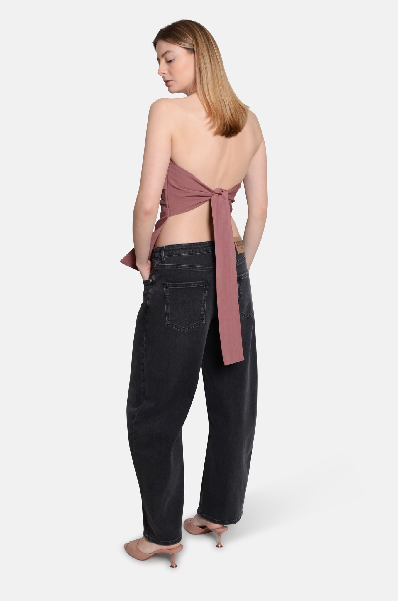 Open back, bustier top made of a viscose-linen blend. It has a simple straight neckline at the front and a bow fastening at the back for an adjustable fit. Designed in Antwerp.