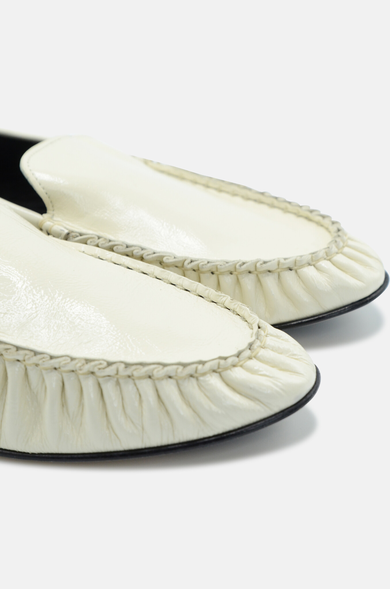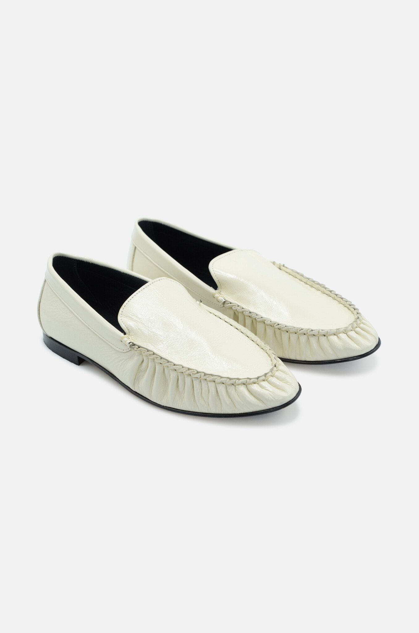 Soft almond shaped, gathered loafers in off-white laminated leather. Designed in Antwerp. Made in Italy.