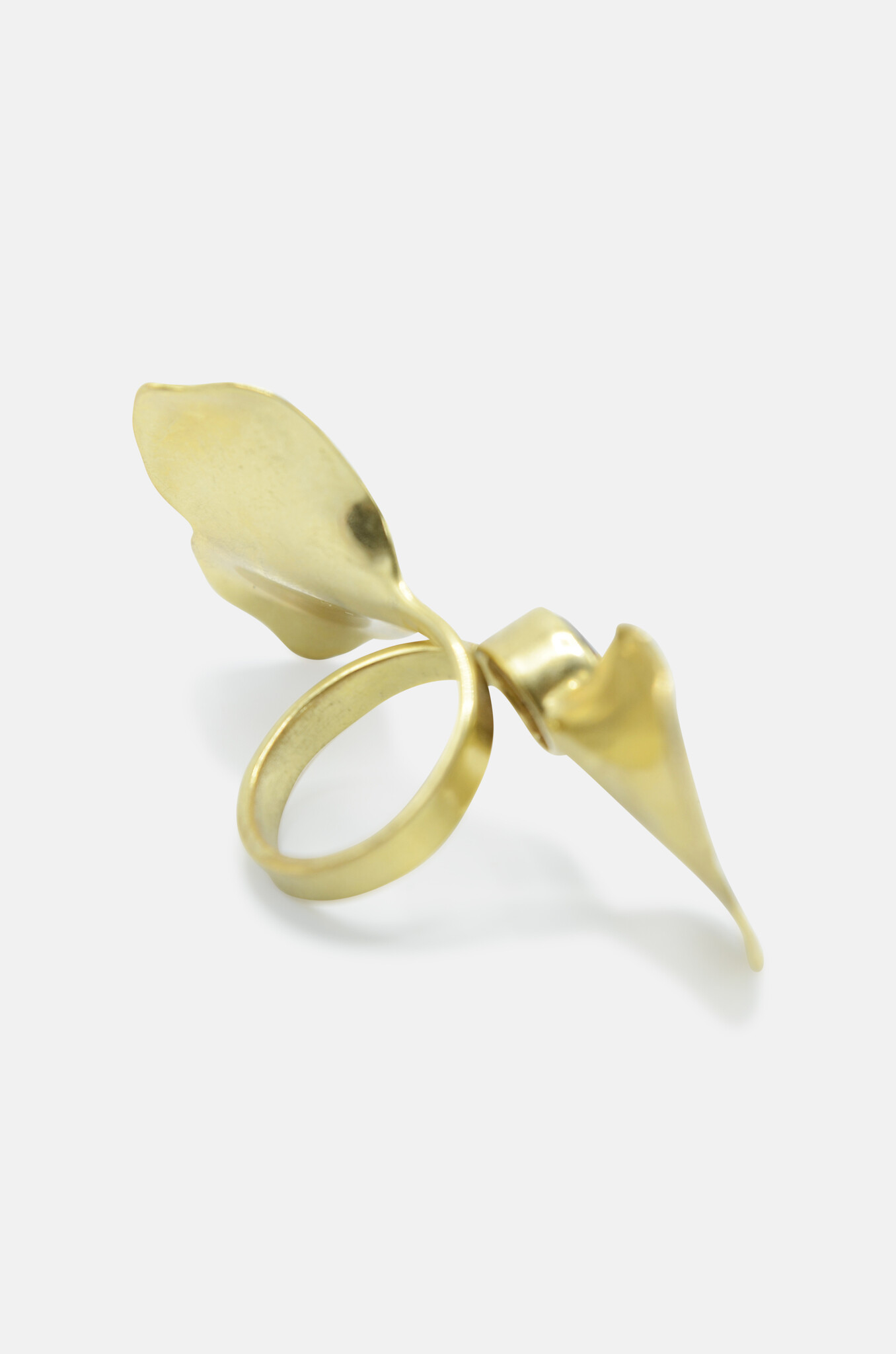 A slightly adjustable ring in the shape of Ginkgo Biloba leaves with a faceted smokey quartz stone inlay. Designed in Antwerp.