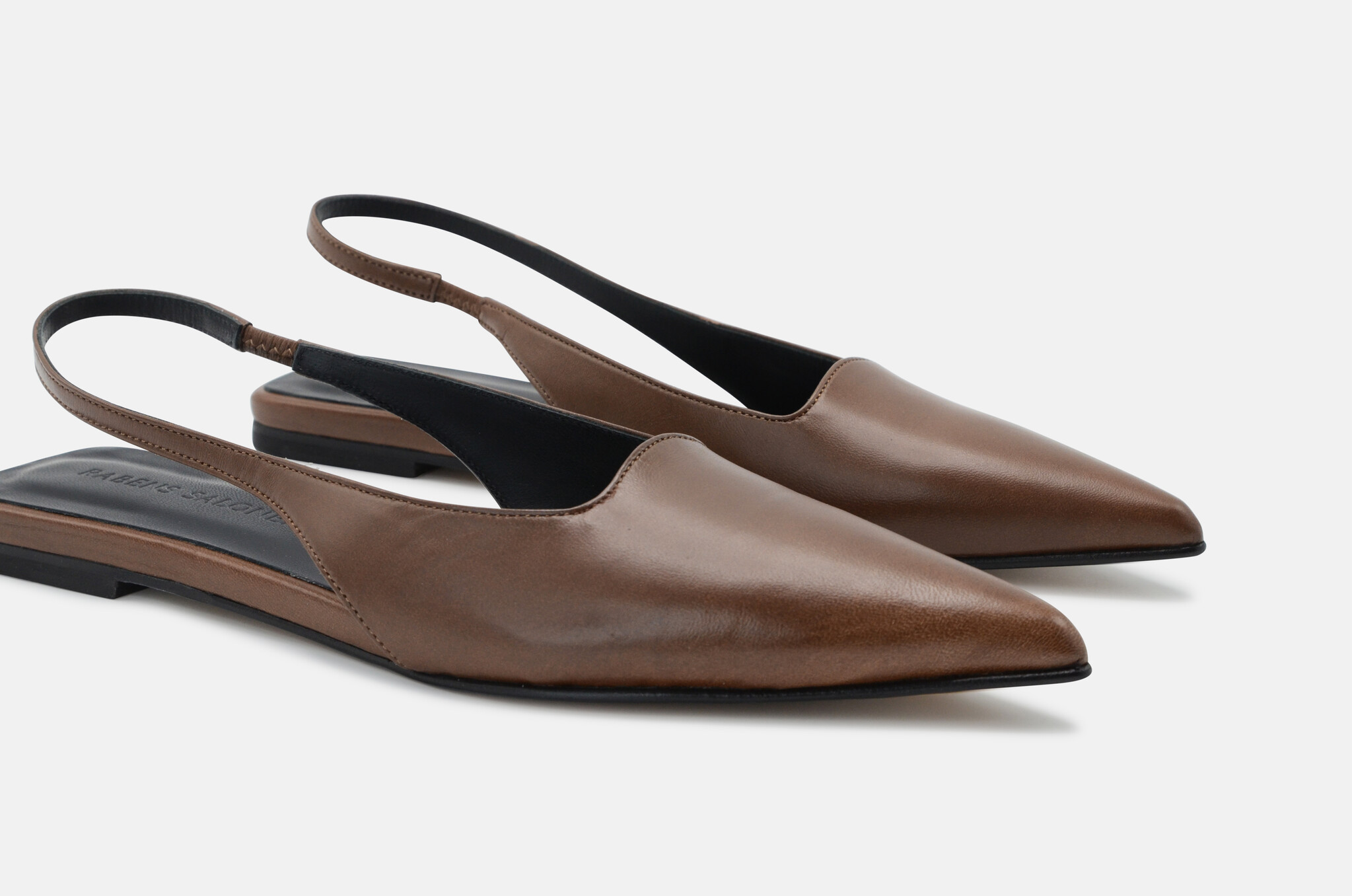 A pointy slingback sandal with a flat sole made from leather with a beautiful shine in Portugal.