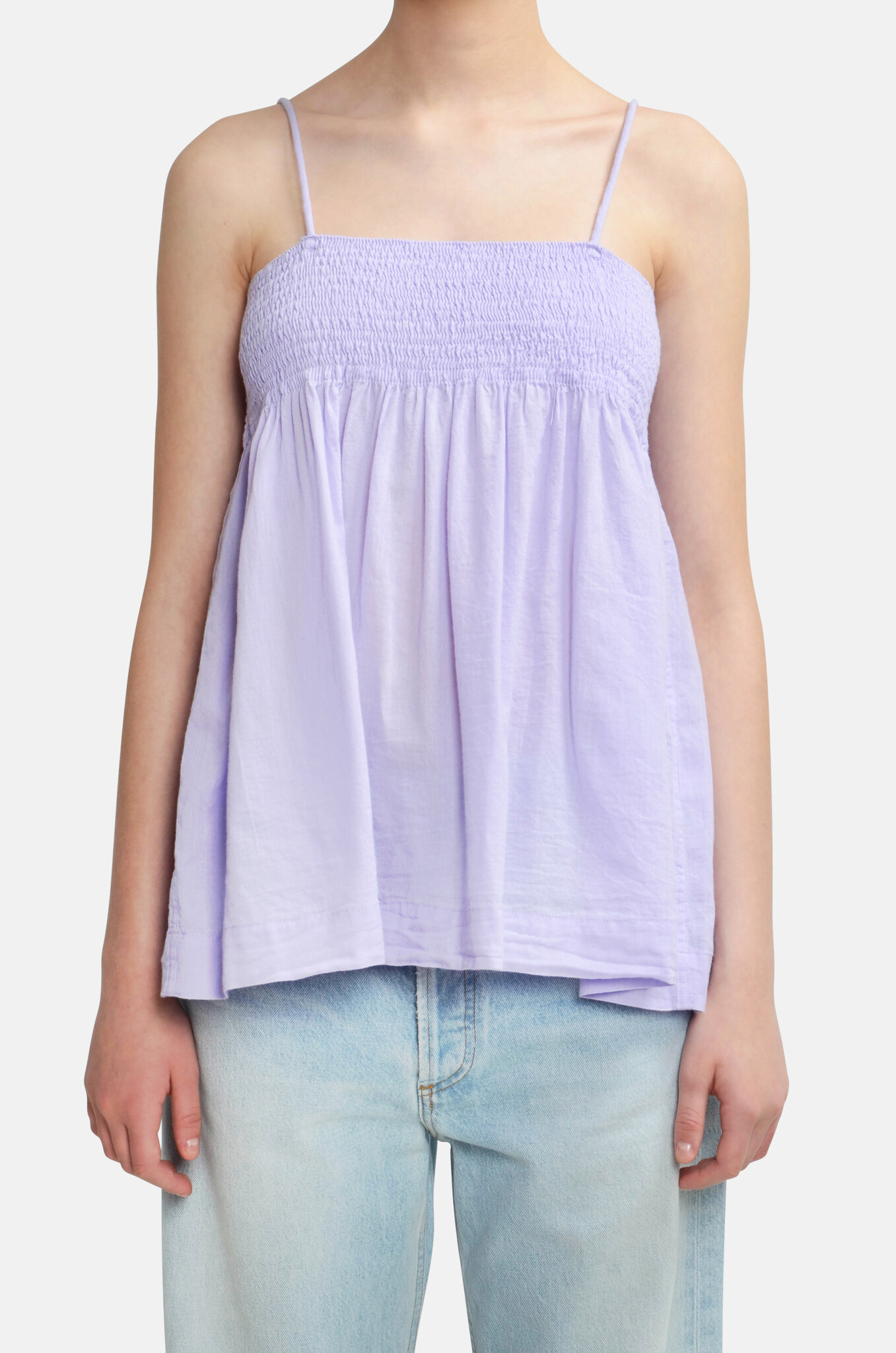 Light cotton, smock top with adjustable, thin straps. It has an A-shape cut.