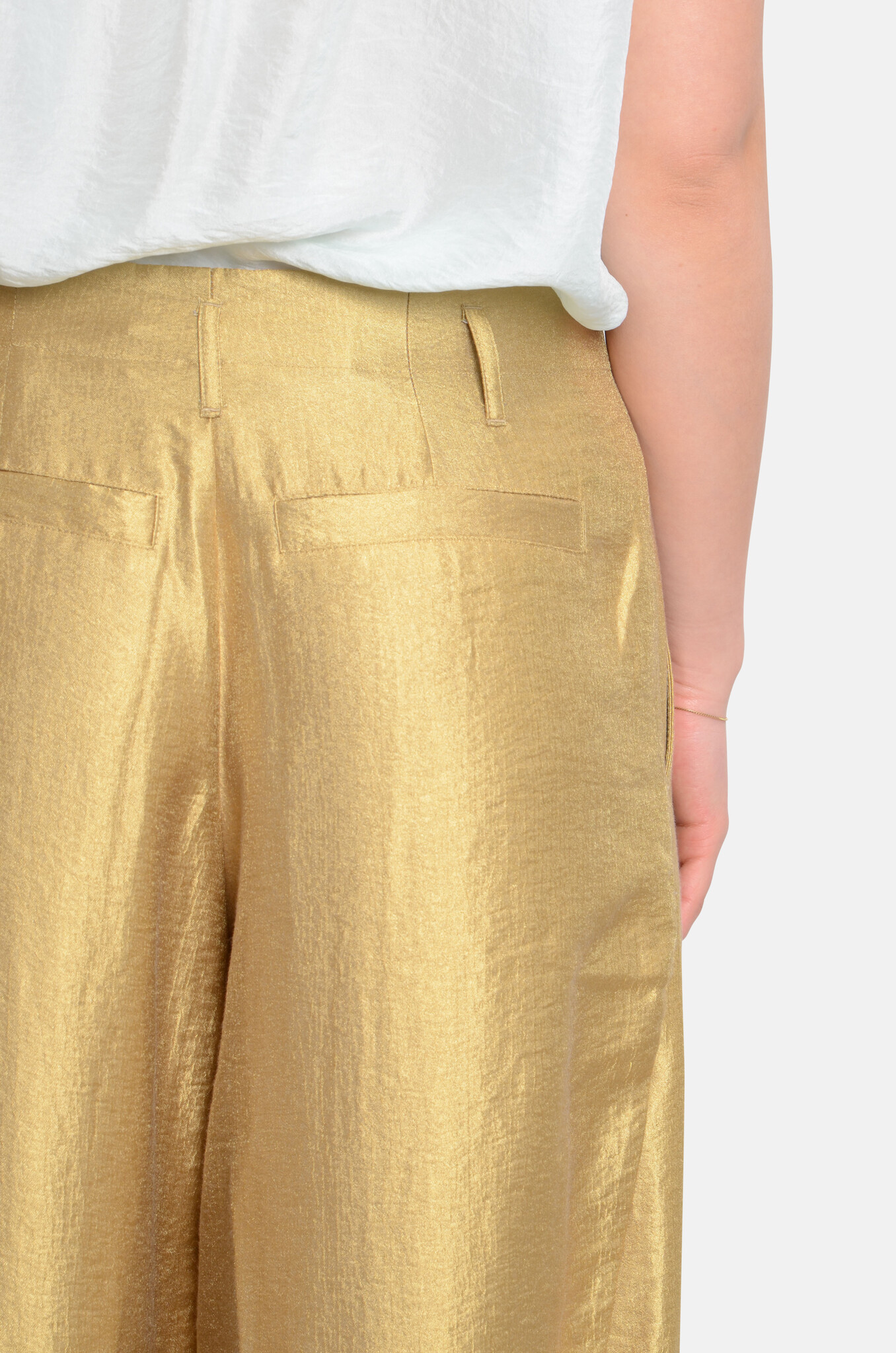 Lightweight, relaxed trousers with a somewhat light, curvy leg in a gold-ish fabric. Seams on the back. Perfect for both everyday wear and special occasions.