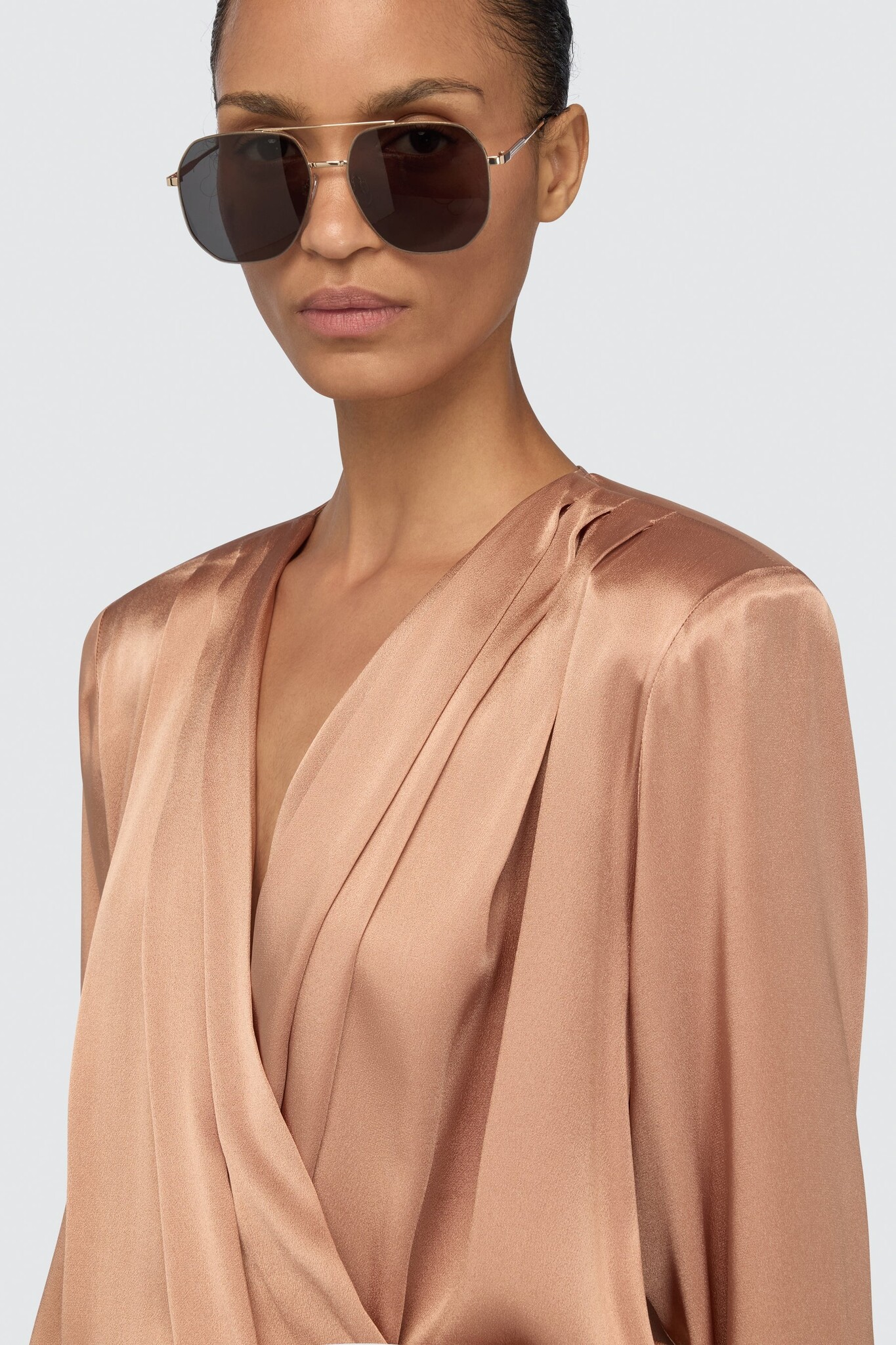 A silk-blend, satin wrap blouse with a belt detail at the bottom with which you can create a bow. It has small shoulder pads. Regular fit. Made in Italy.