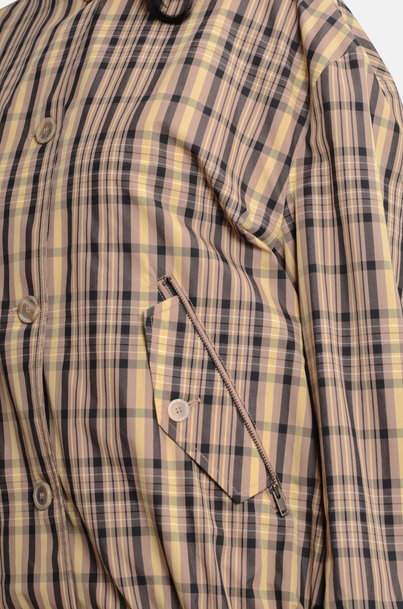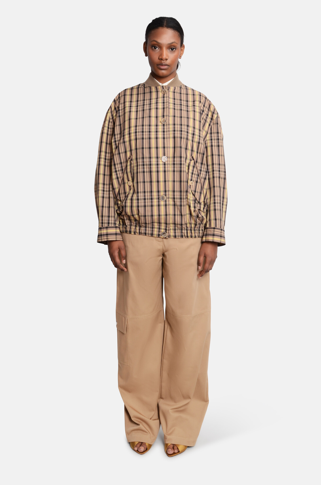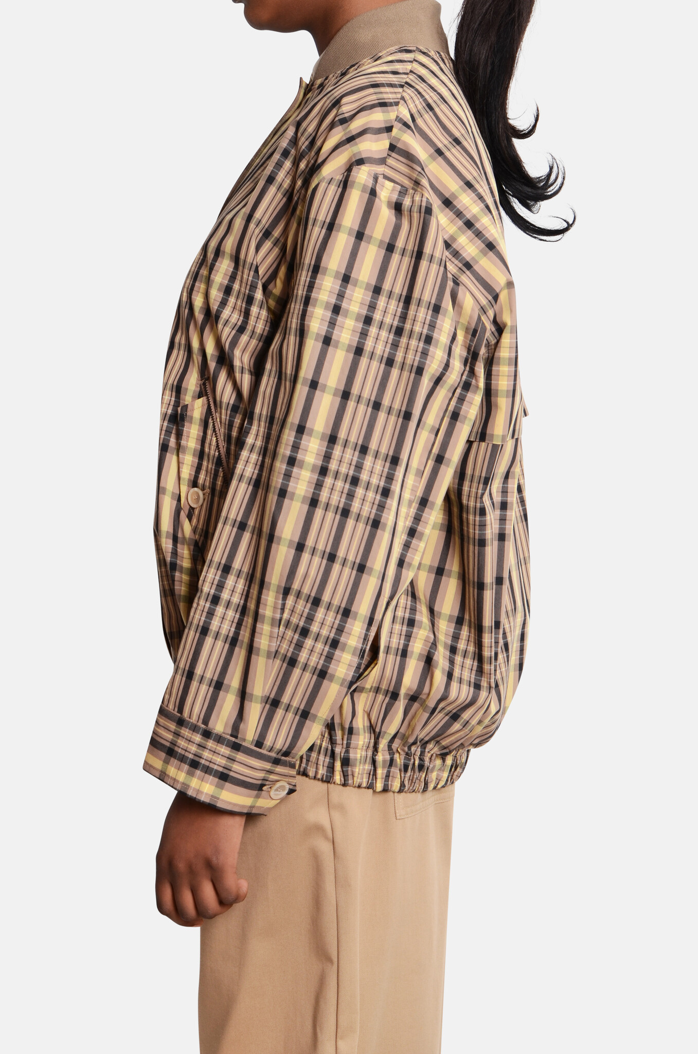 Oversized bomber jacket with a jersey collar, two buttoned front pockets and an elastic waistband.