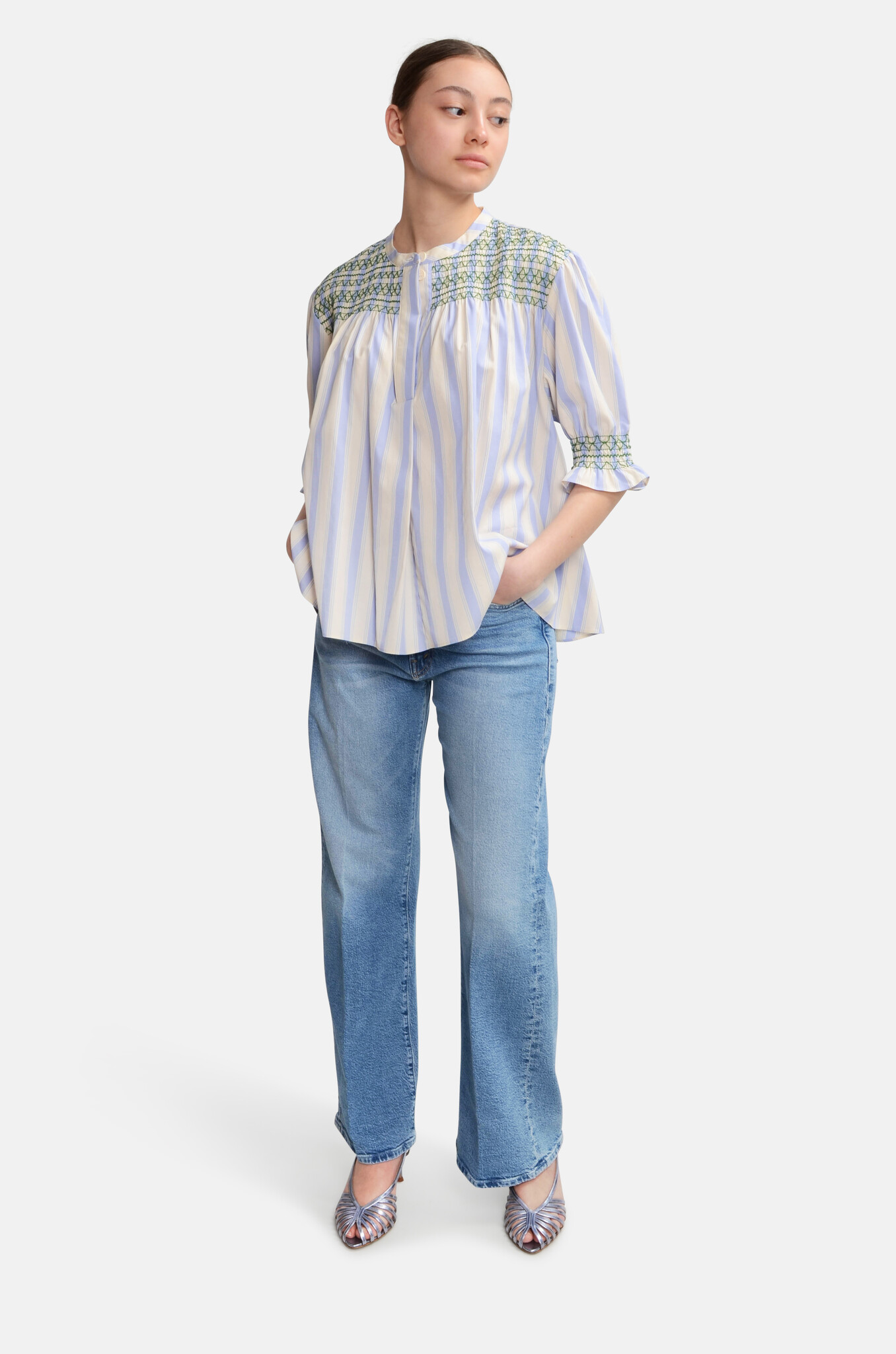 Loose-fit shirt in organic cotton with light blue and off-white stripes. It has a green elasticated smock detailing in the front and back and on the cuffs giving the short sleeves an elegant, feminine touch. It has an half-buttoned front.