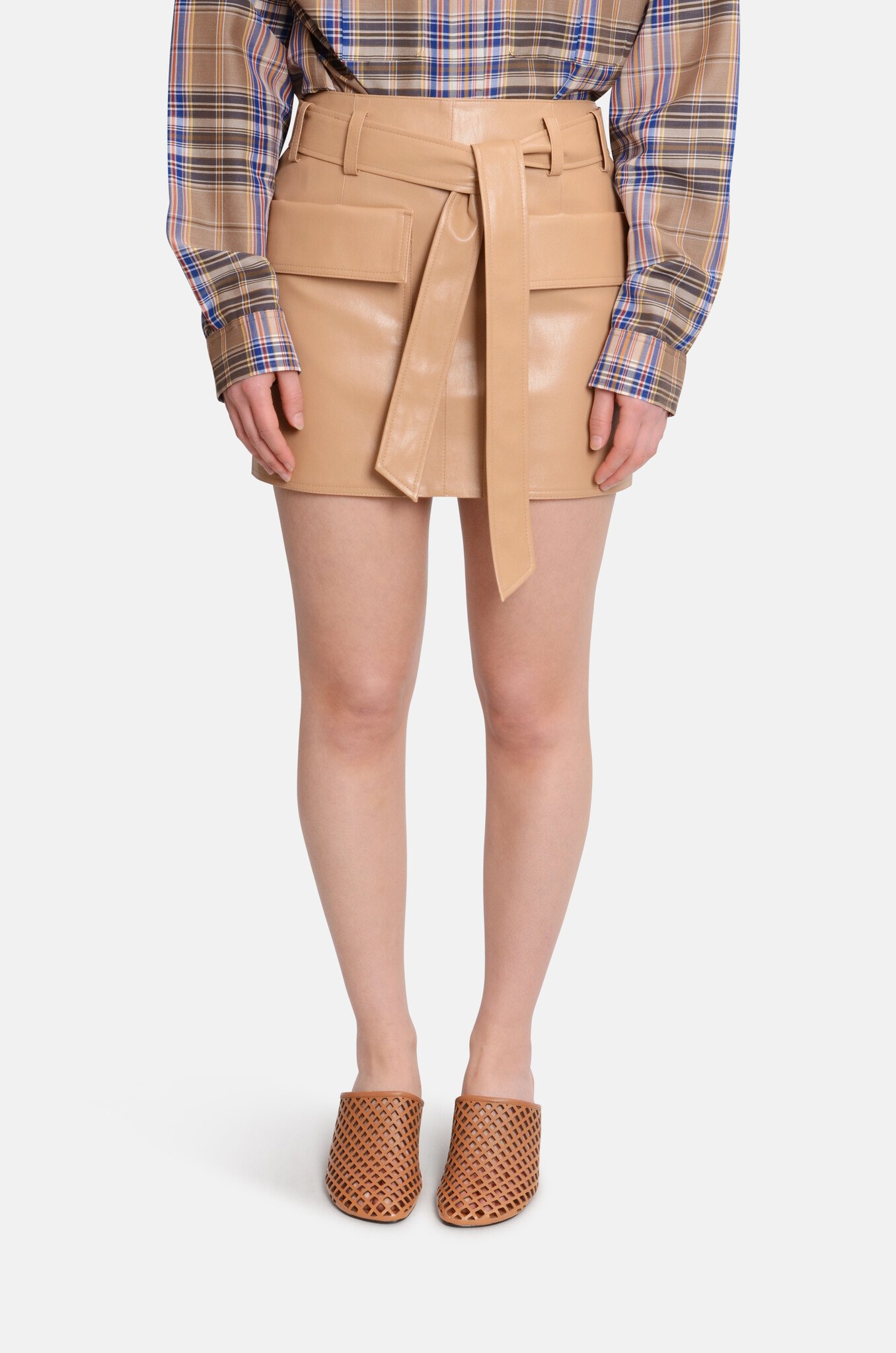 Utilitarian-style mini skirt in faux-leather. It. has two prominent front pockets, adding a practical and stylish element to the smooth, coated surface. Zip-closure in the back.