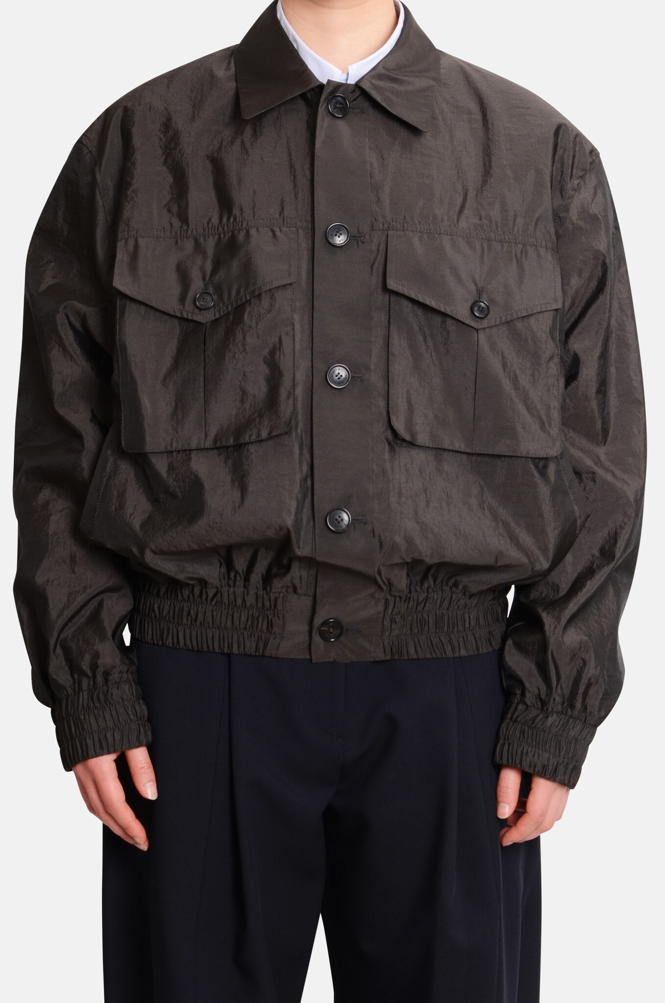 A lightweight blouson with two front pockets made from a refined, slightly sheer material. Made in South Korea.