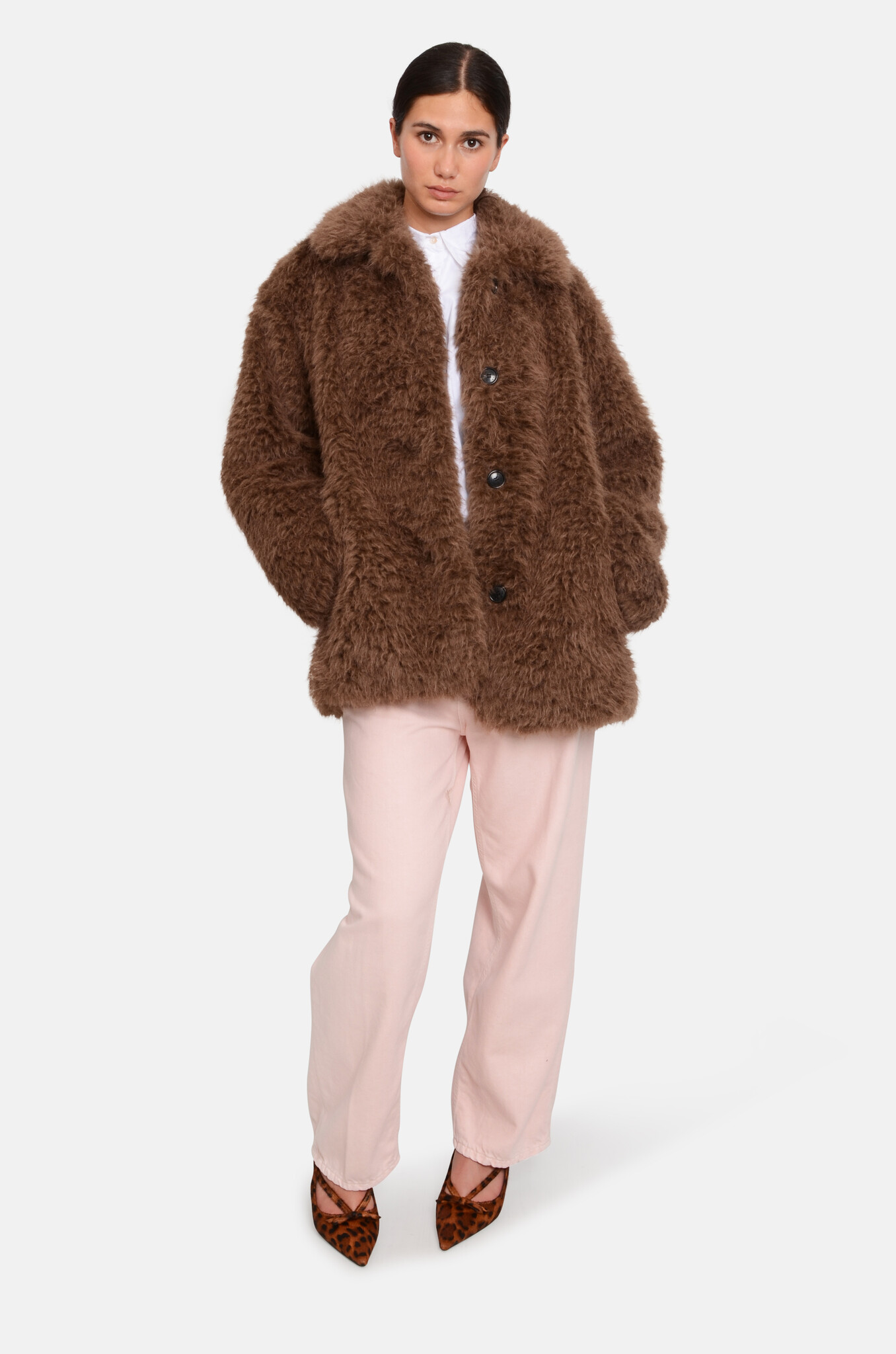 A slightly curved, faux fur jacket with a classic collar and button closure. Made in South Korea.